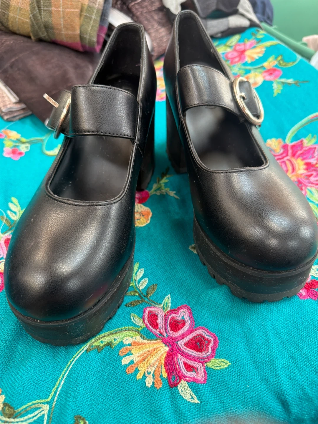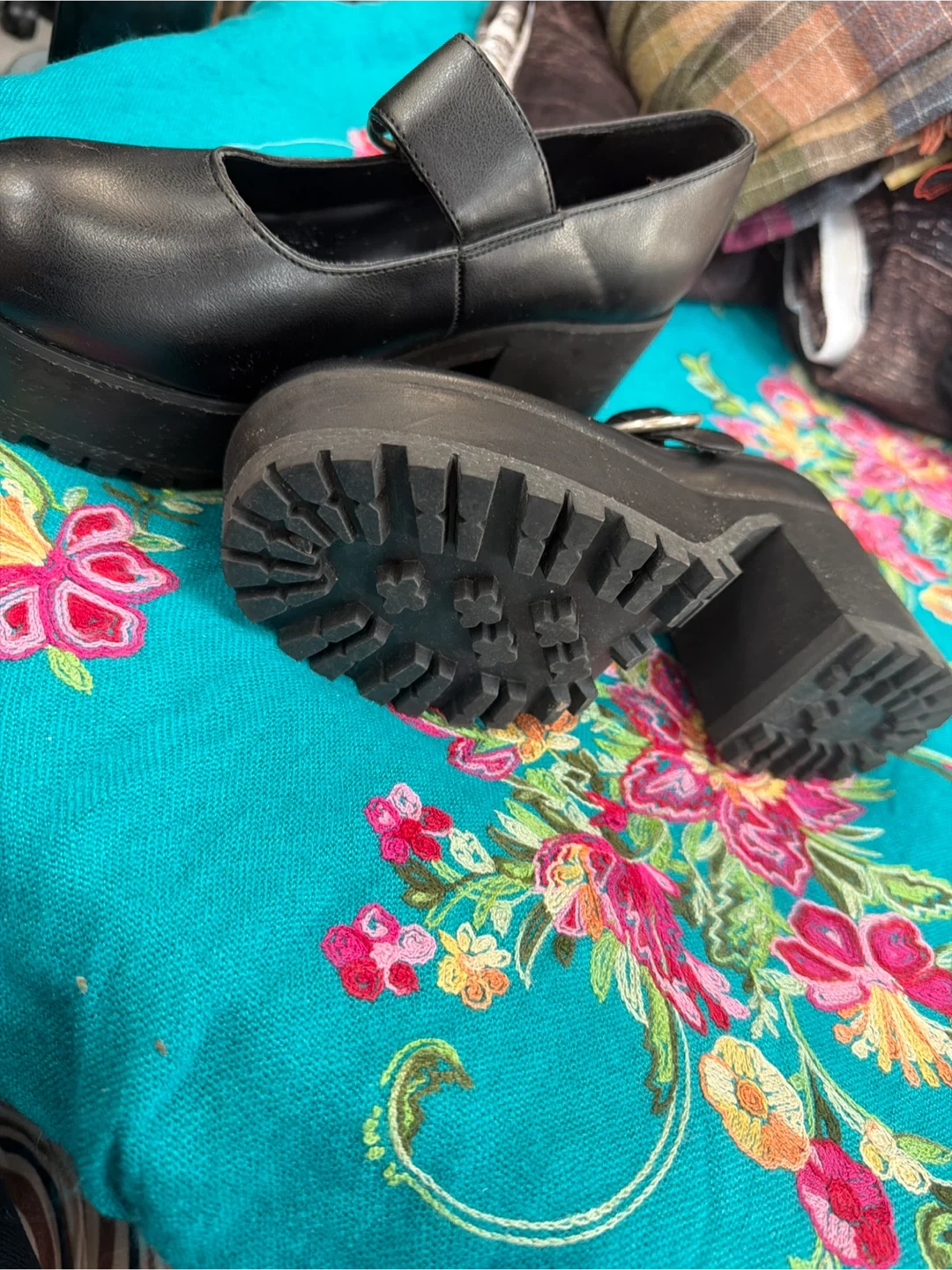 Black platform Mary Jane shoes from Current Mood. Faux leather upper with a buckle strap closure. Chunky lug sole adds edgy style. Size is 7.