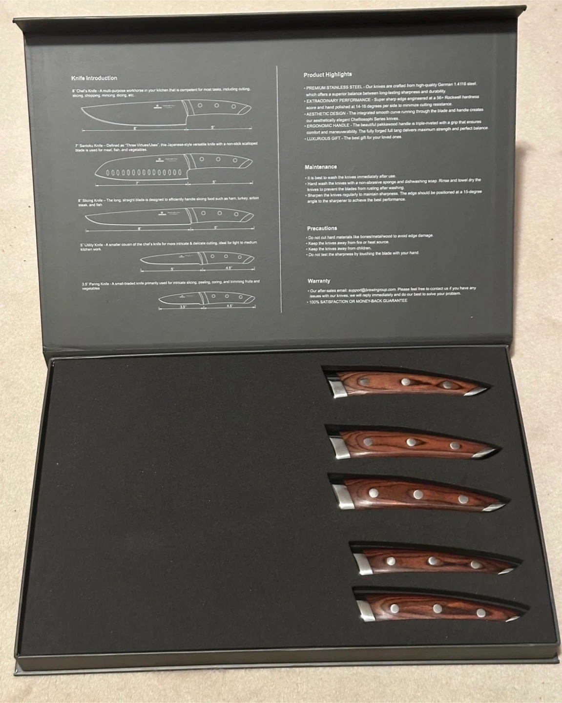 This BREWIN 5-piece kitchen knife set includes 5 knives crafted from high-quality German 1.4116 stainless steel. Each knife features a Pakkawood handle for a comfortable grip. The set comes with a Chef's Knife, Serrated Knife, Utility Knife, and two Paring Knives. It's a great set for any home cook!