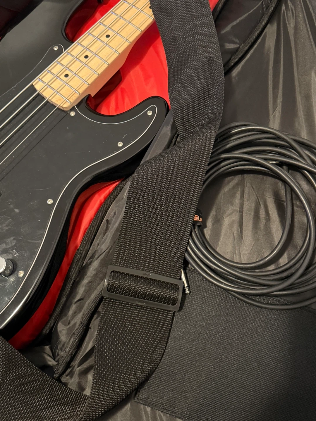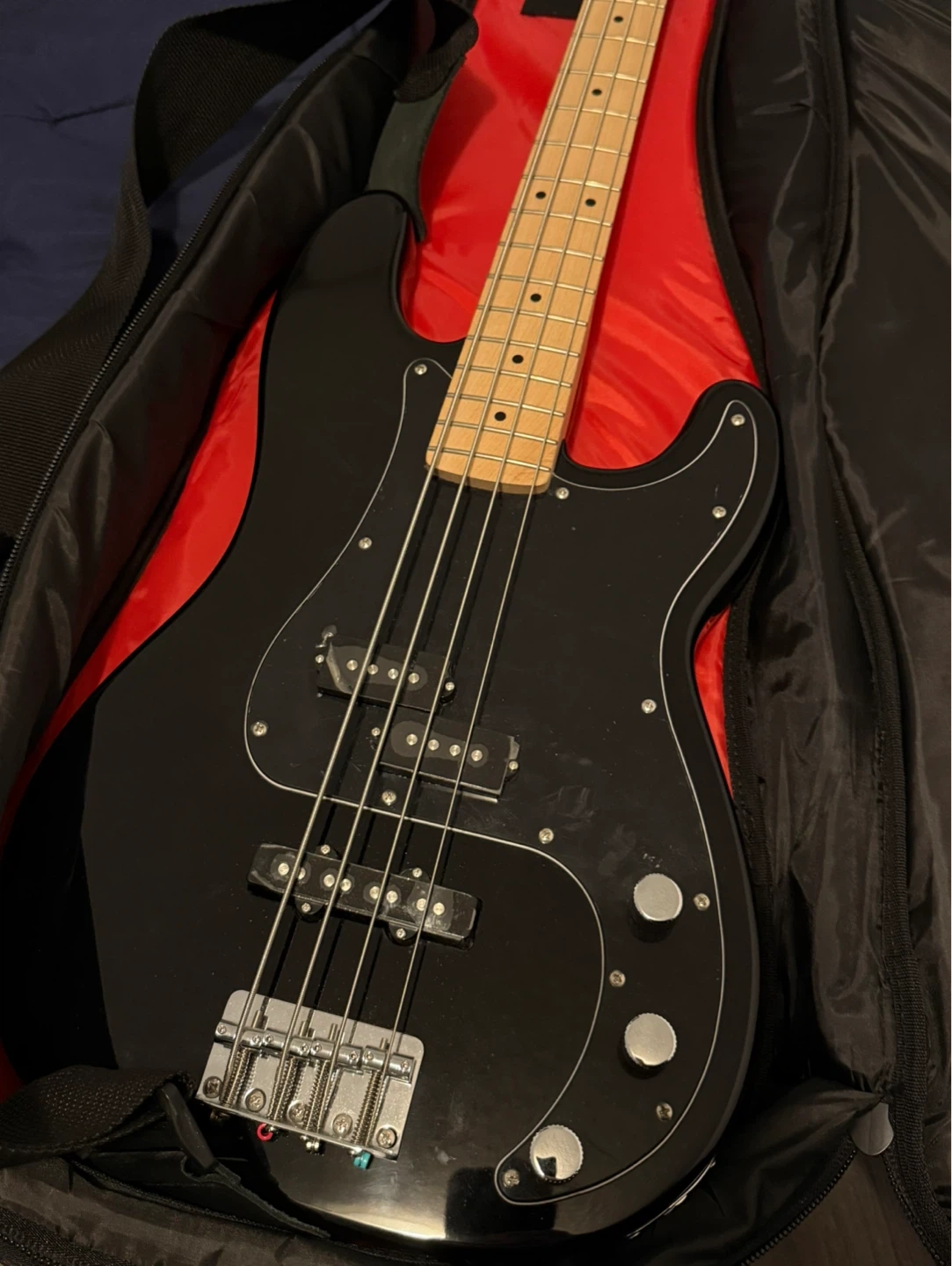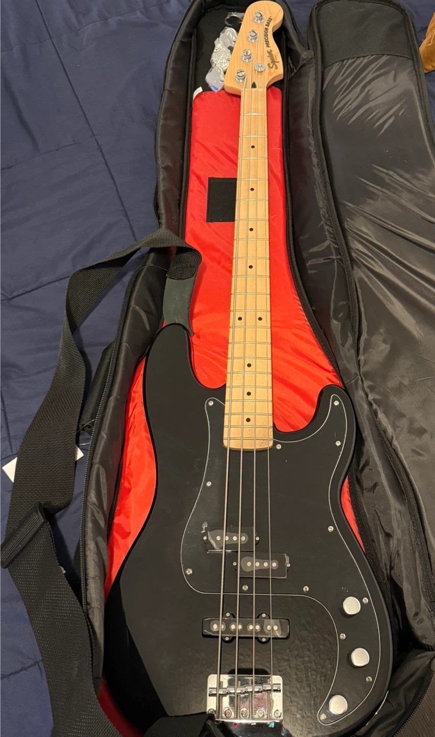LIKE NEW! Black Squier Precision Bass guitar. Includes a black gig bag and a black guitar cable. Maple neck and fretboard. Great for learning or jamming!