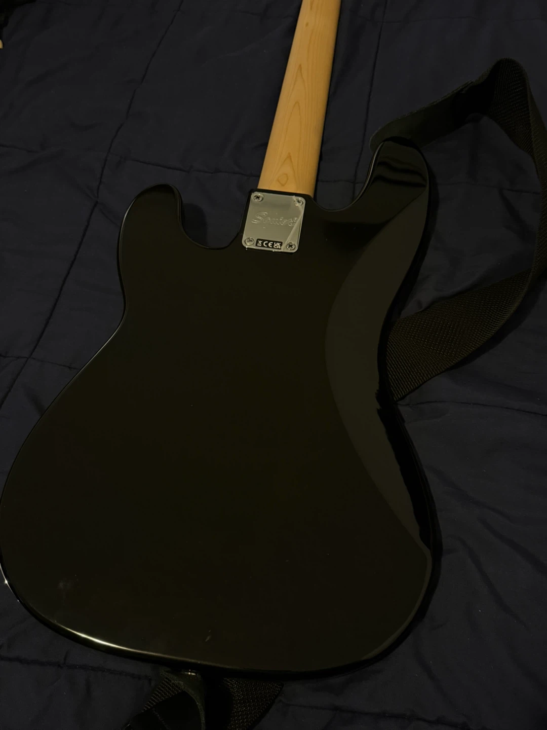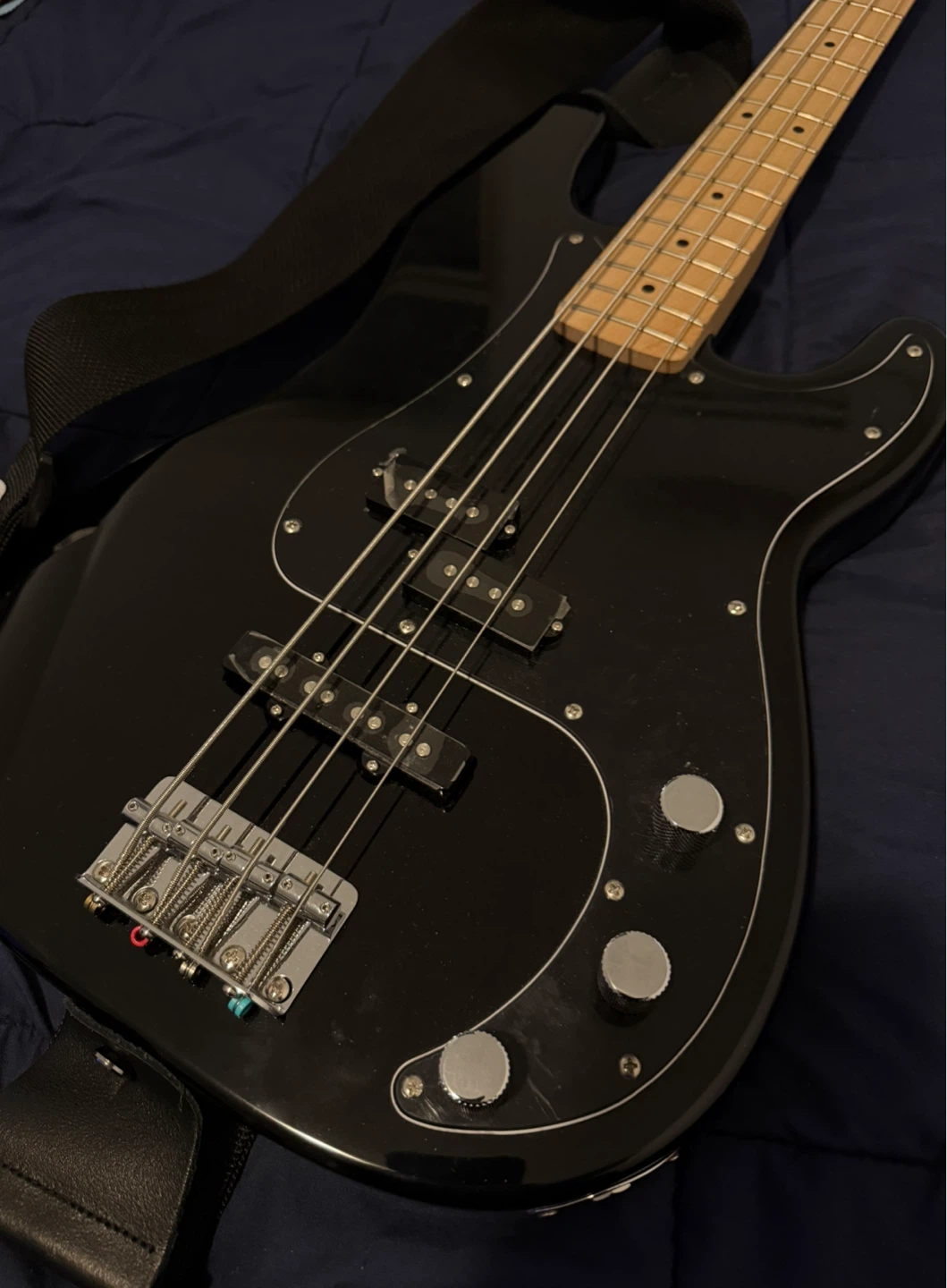 LIKE NEW! Black Squier Precision Bass guitar. Includes a black gig bag and a black guitar cable. Maple neck and fretboard. Great for learning or jamming!