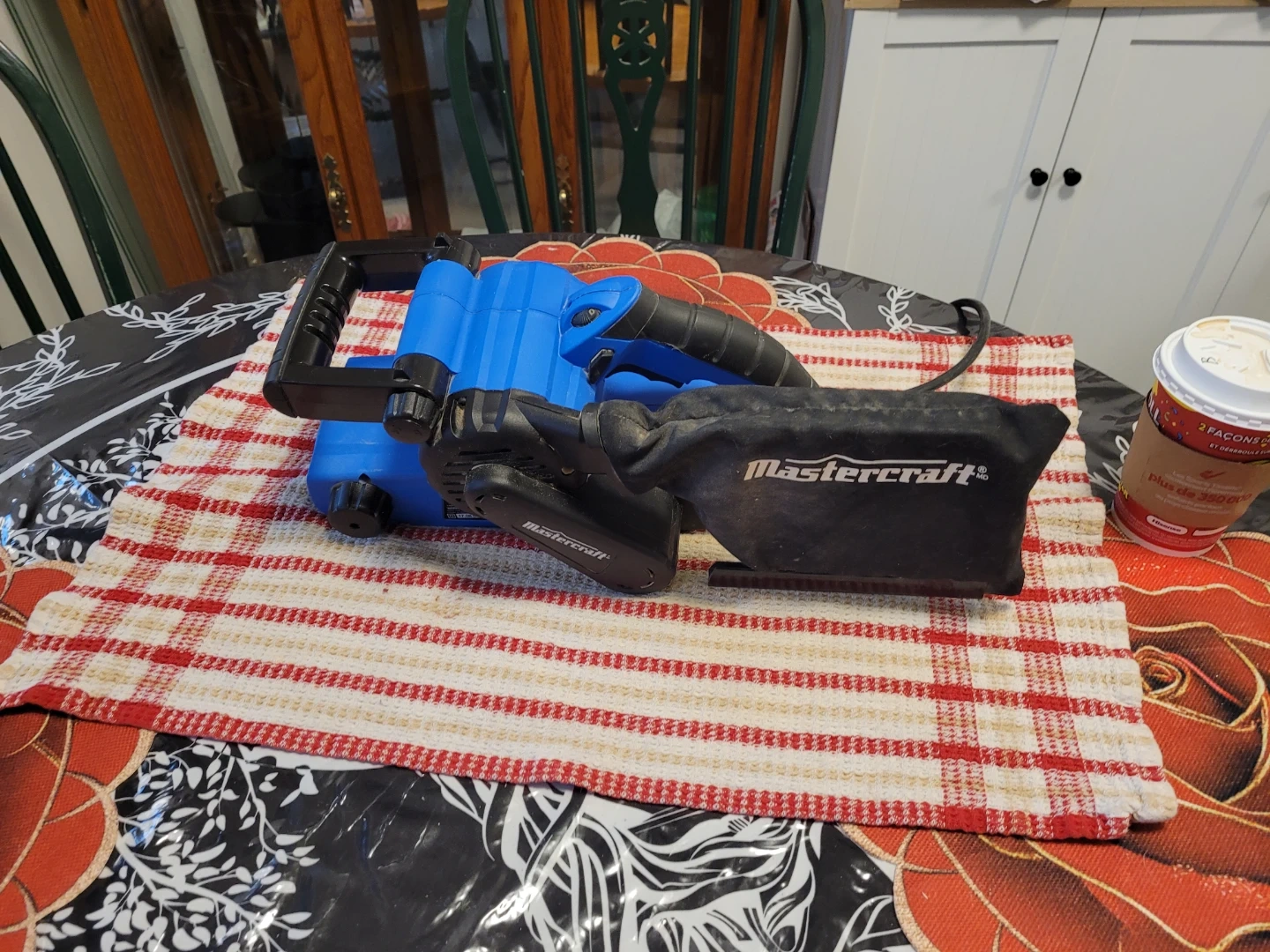 This is a Mastercraft belt sander, perfect for your woodworking projects. It's blue and comes with a dust bag attachment. The sander has adjustable speed settings for different materials. It's a handy tool for smoothing surfaces quickly!