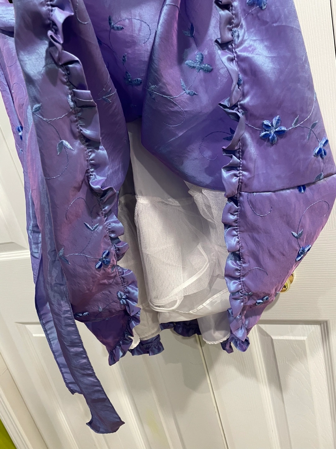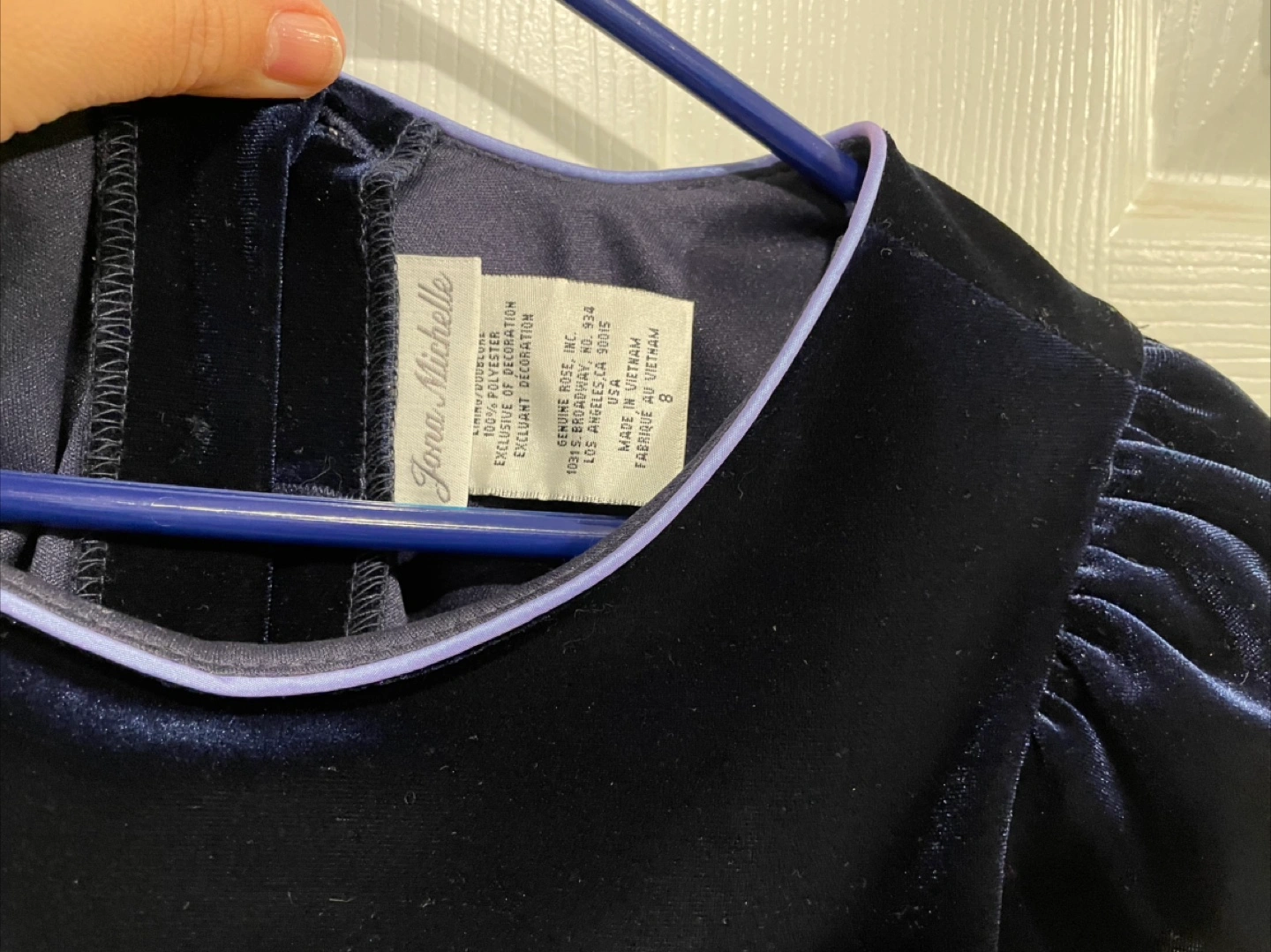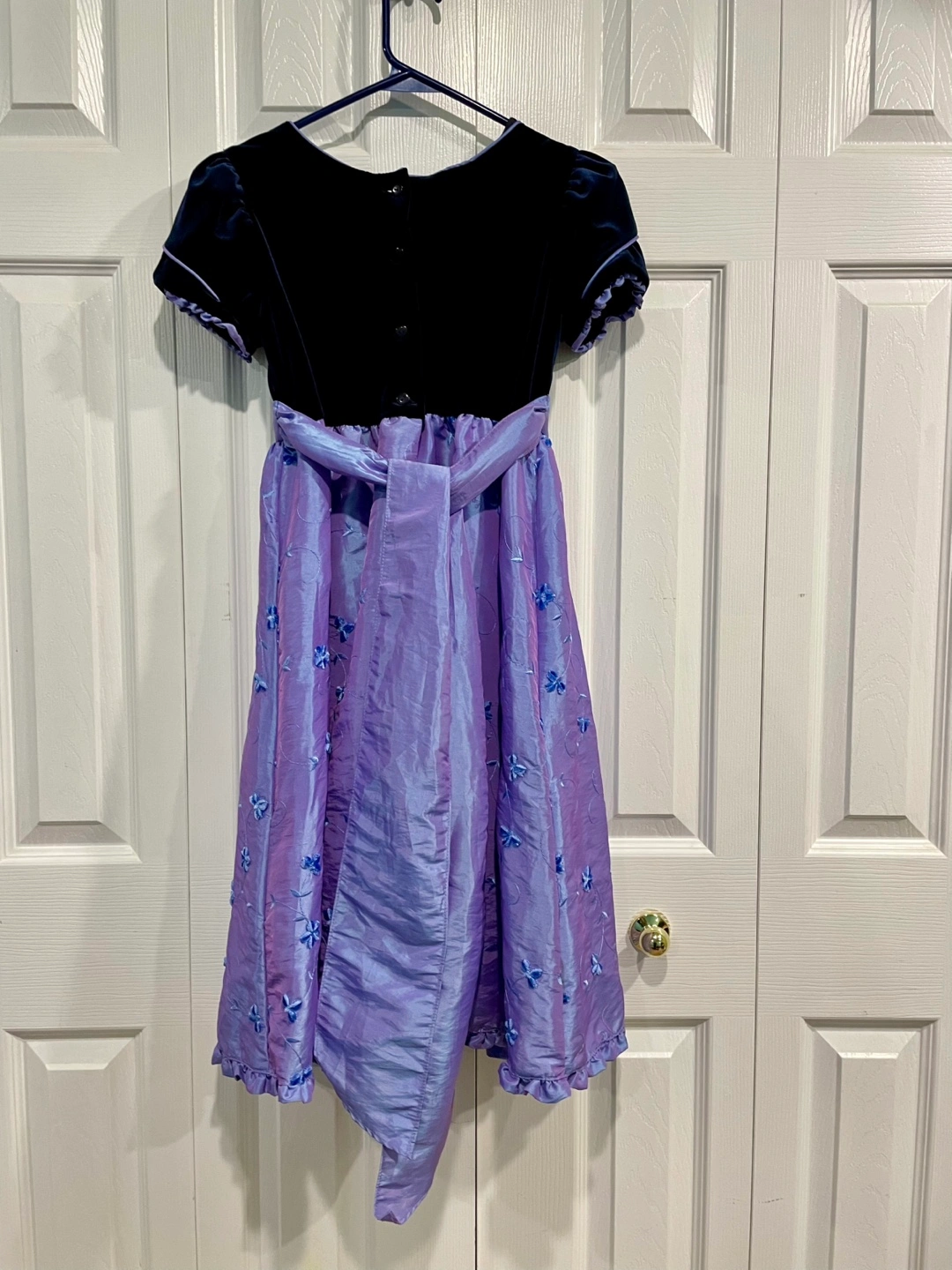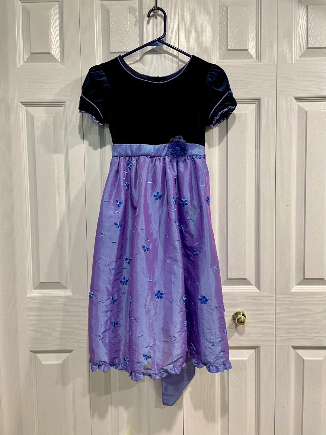 A lovely Jona Michelle dress for girls, size 8! The dress features a black velvet top and a beautiful purple skirt with floral embroidery. Perfect for a special occasion!