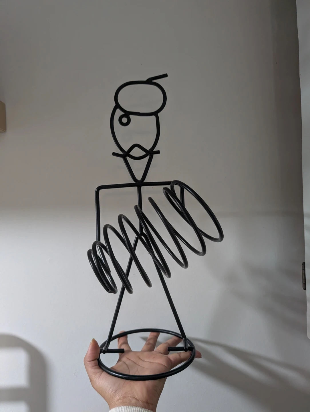 A decorative black metal wire holder shaped like a person. It's designed to hold wine bottles or oil bottle. This piece adds a whimsical touch to any dinner table or kitchen