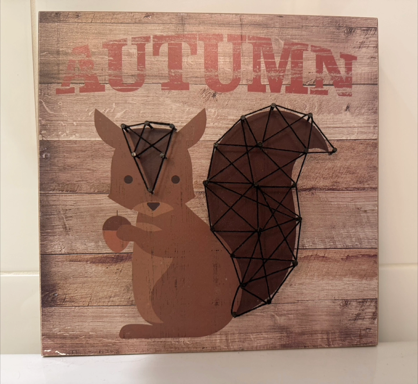 Adorable string art featuring a squirrel and the word Autumn. Wooden frame. Perfect for fall decorating.