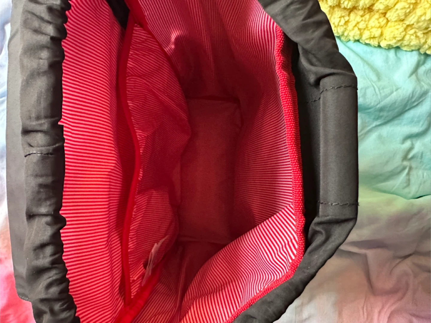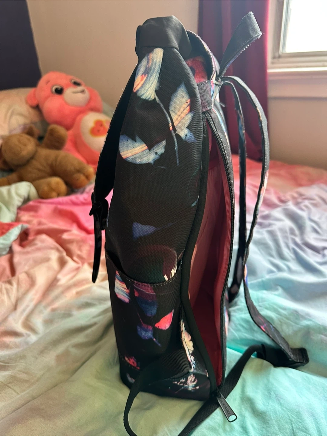 Herschel backpack in black with floral print and red and white striped interior. Flap closes over the top with buckle details. Side-zip pocket at the back which is great for easy packing and removal of laptops or tablets. Used but in great condition! Cash and pick-up only from King West & Blue Jays.