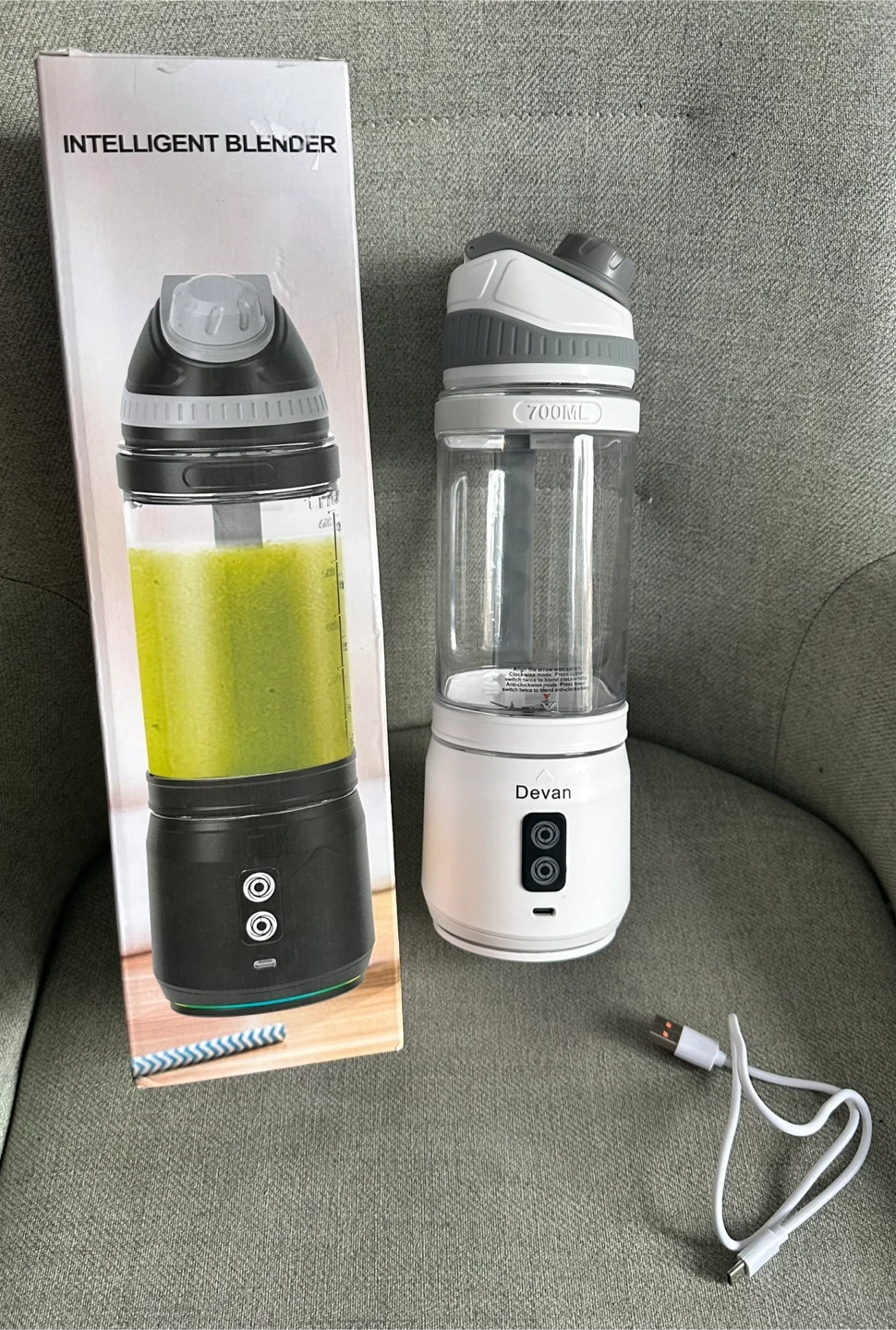 This Devan A11 Pro is an intelligent blender with a 700mL bottle capacity. It's made with a Tritan bottle and ABS base shell material. The blade is 304 stainless steel, and it runs on 12V with 300W power. It includes a USB charging cable.