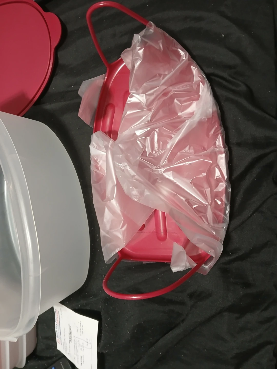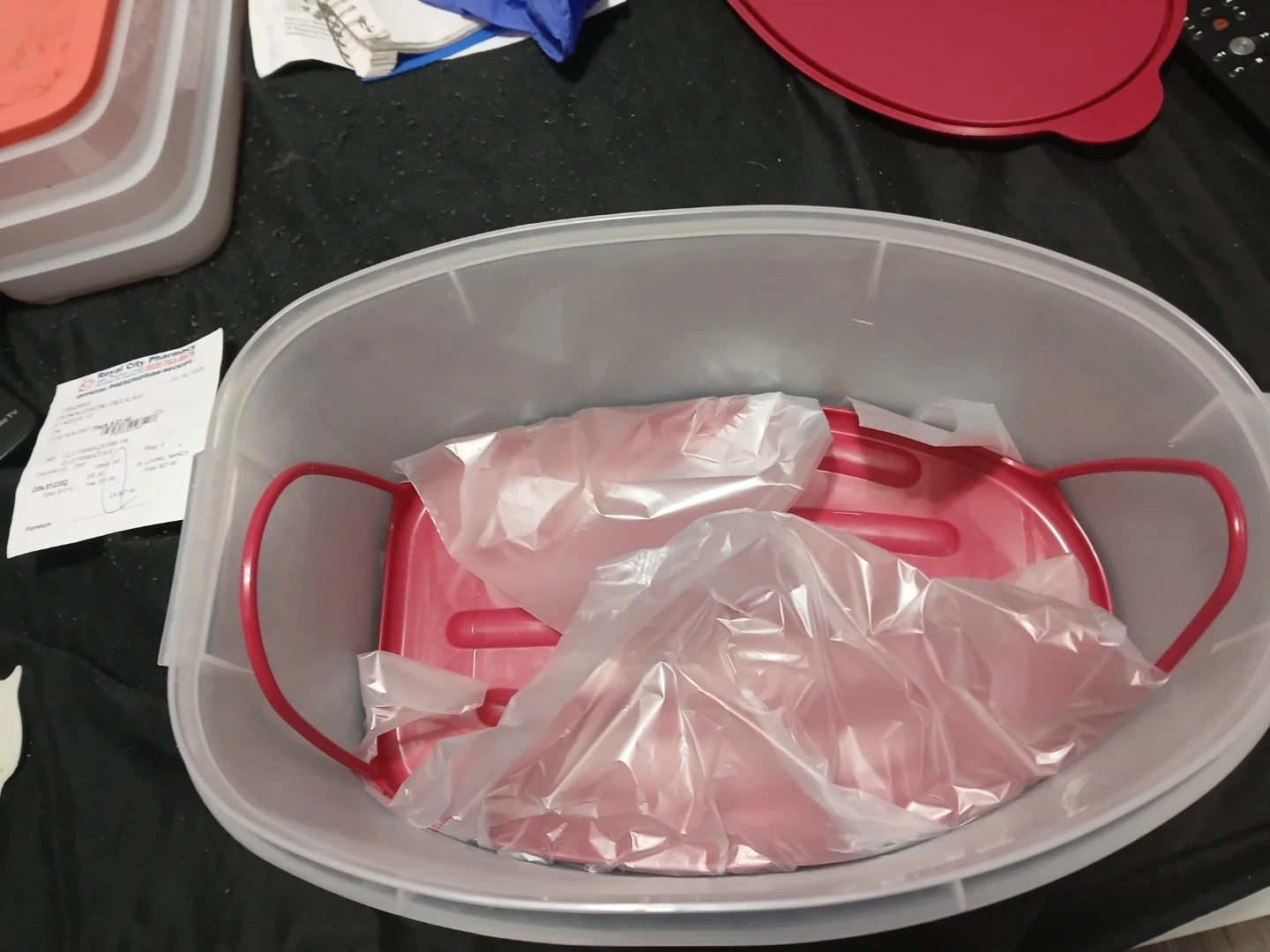 This is a clear plastic food storage container with a bright red lid. It's oval-shaped and has red handles on the inner tray. The container's dimensions are roughly 17 inches long, 10 inches wide, and 6 inches tall. It's great for storing leftovers or bulk food items.and it Tupperware.