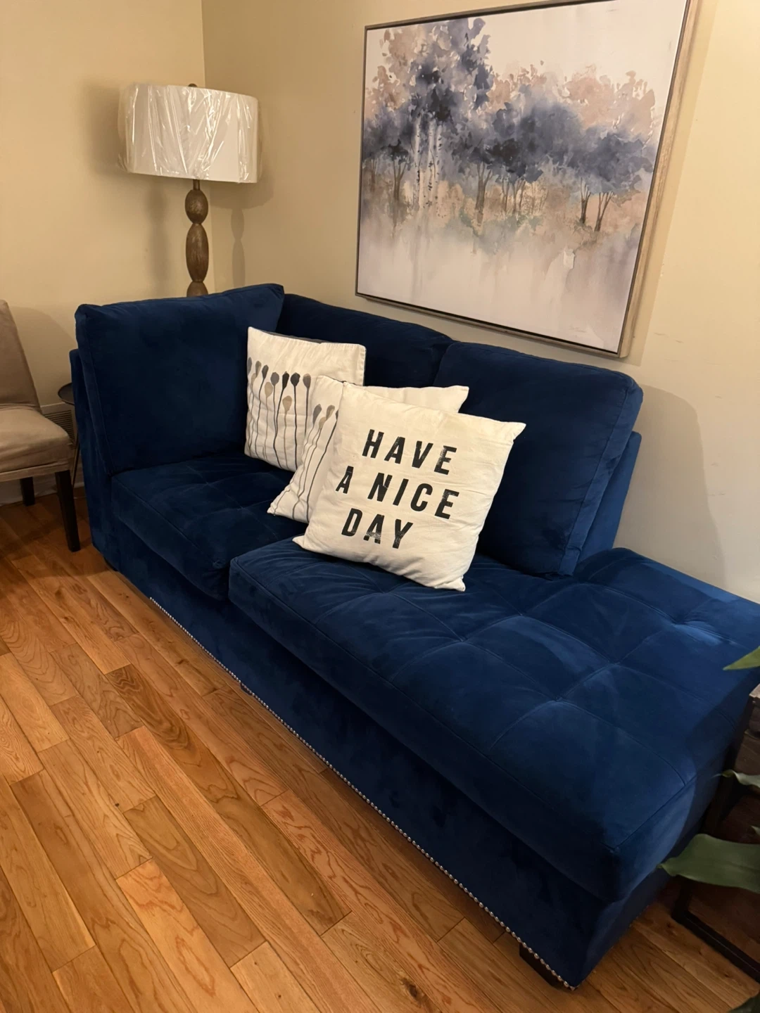 Selling a comfy blue velvet sofa with a chaise lounge! It's in great condition and would be a lovely addition to any living room. The material is soft and the colour is a rich, deep blue. It's perfect for relaxing and adding a touch of elegance to your home