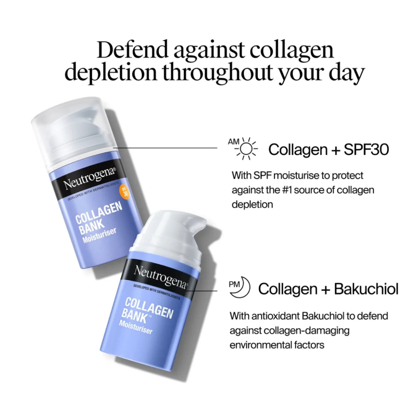 Neutrogena Collagen Bank Moisturizer for normal to combination skin. Formulated with patented micro-peptide technology, collagen, and bakuchiol. This dermatologist-recommended brand offers a fragrance-free, paraben-free formula. 2 fl. oz. (59 mL).