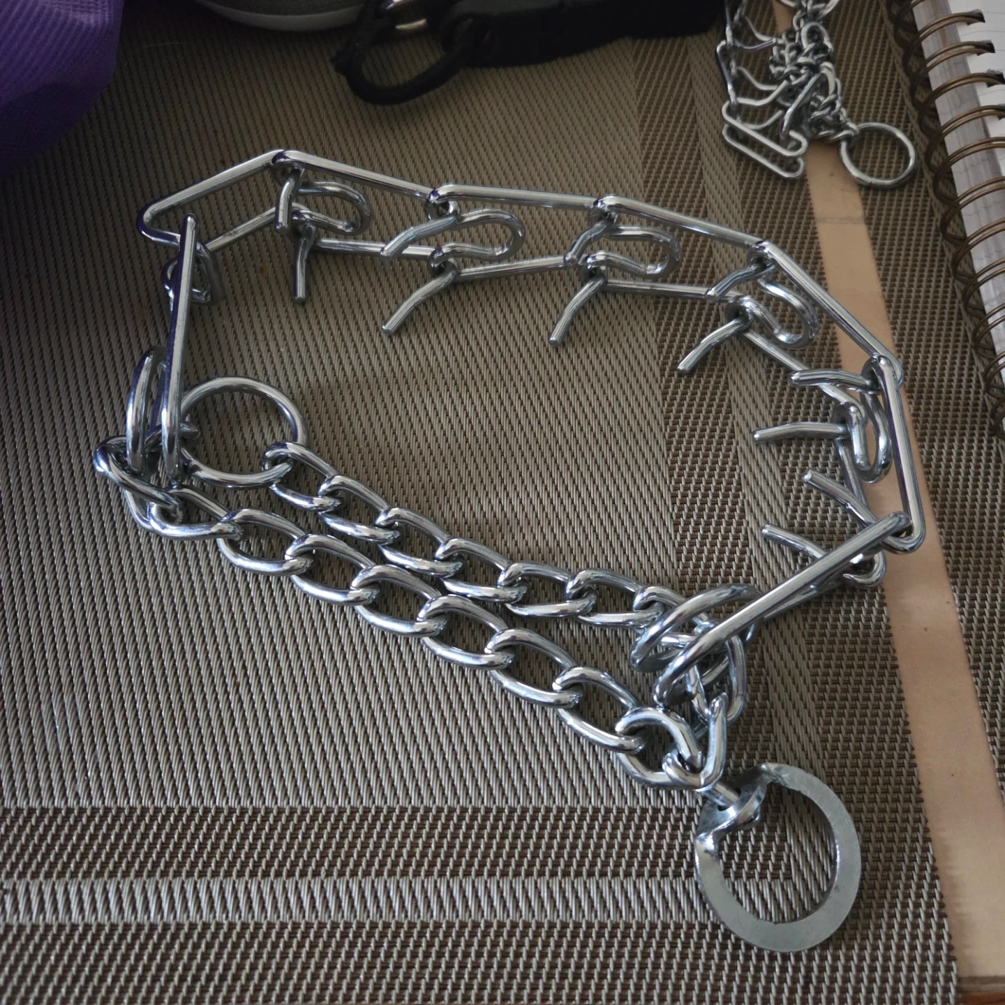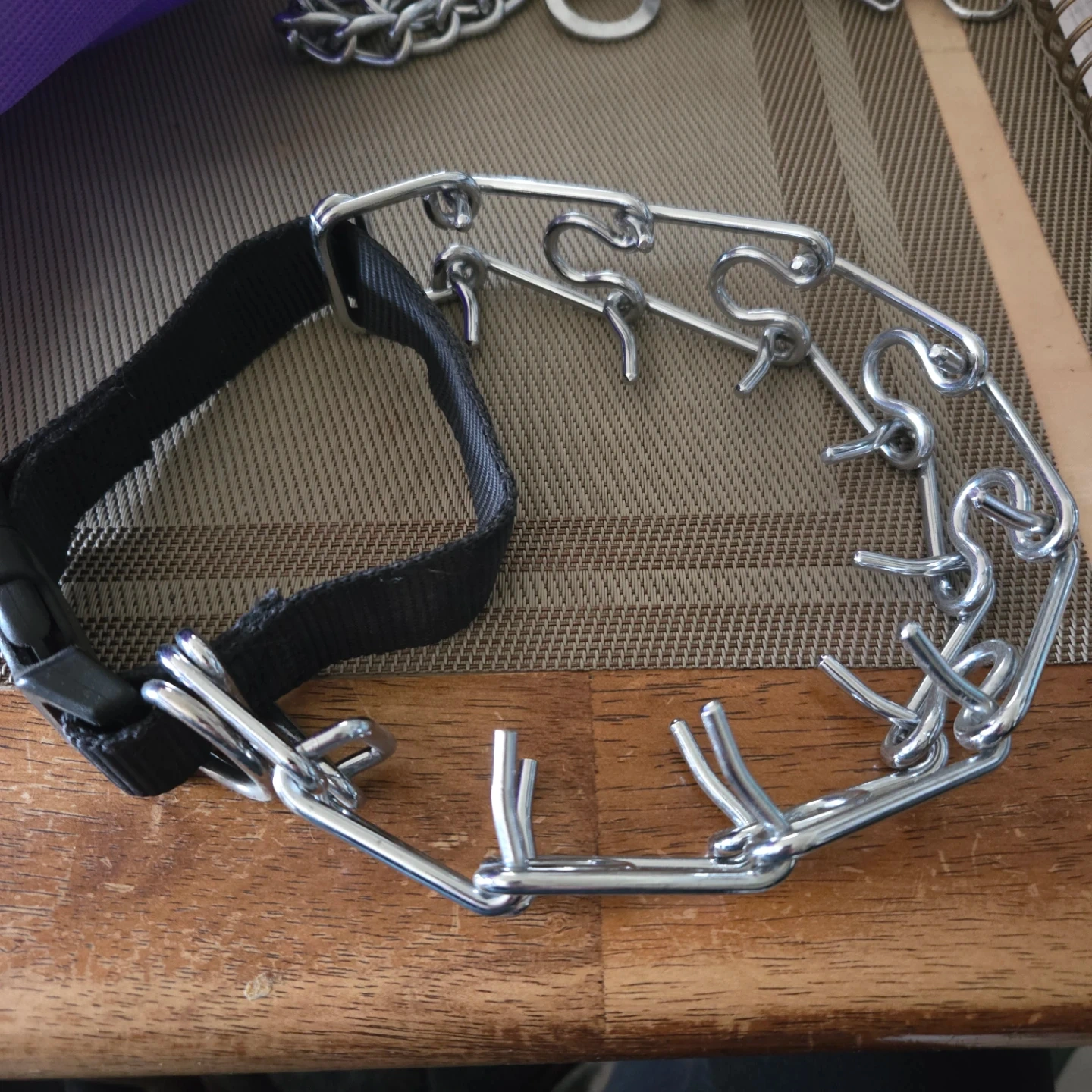 Metal prong collar with black nylon strap. Adjustable length with a buckle closure. Great for training purposes!
