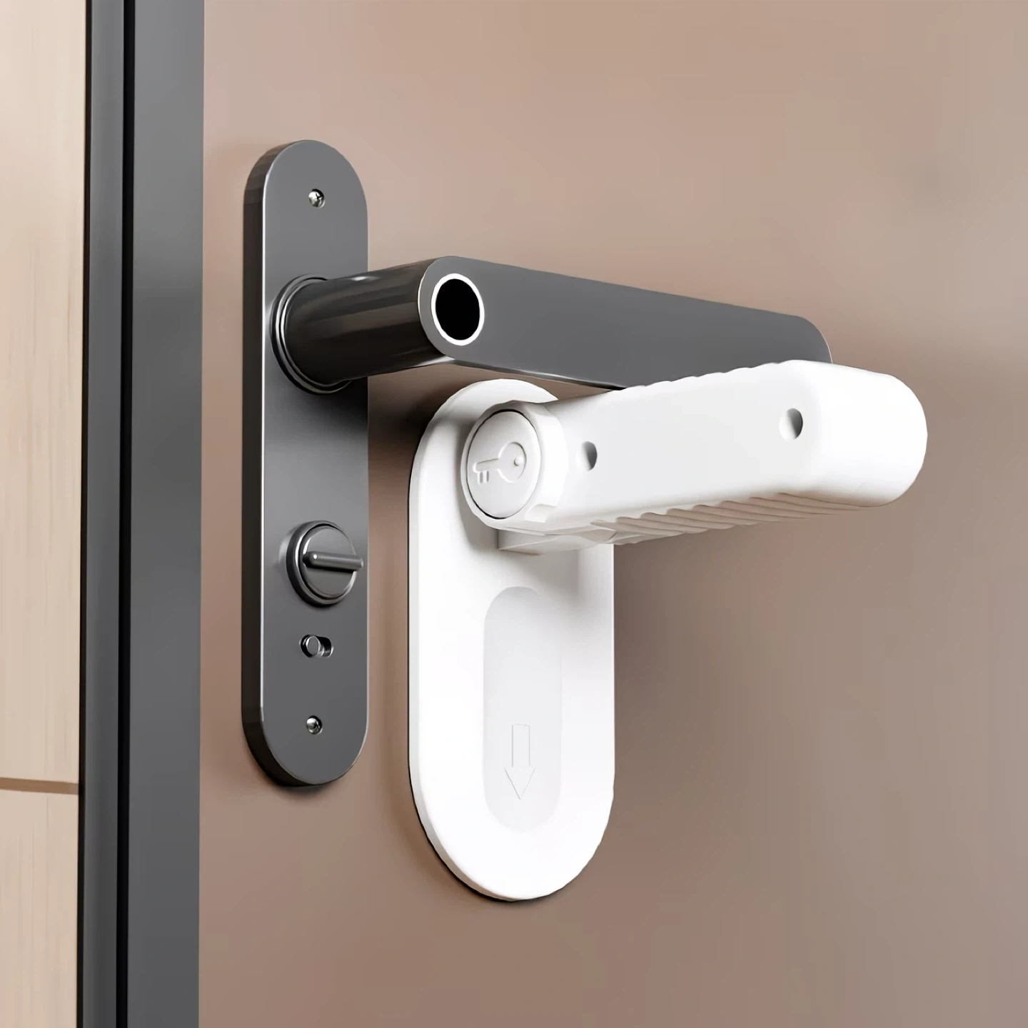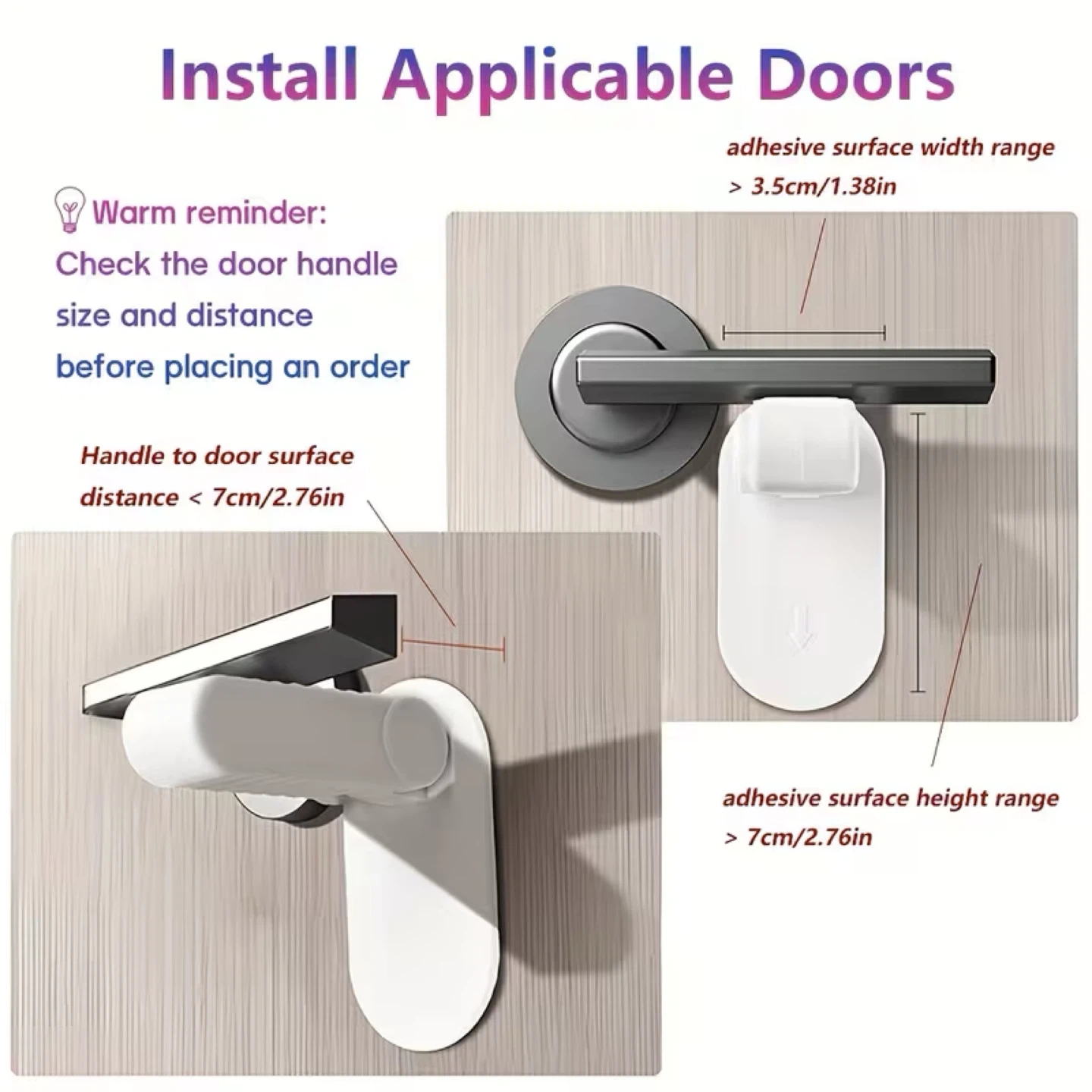 Child safety lock for lever-style door handles. Keeps doors securely closed to prevent children from accessing certain rooms. Easy to install with adhesive surface.