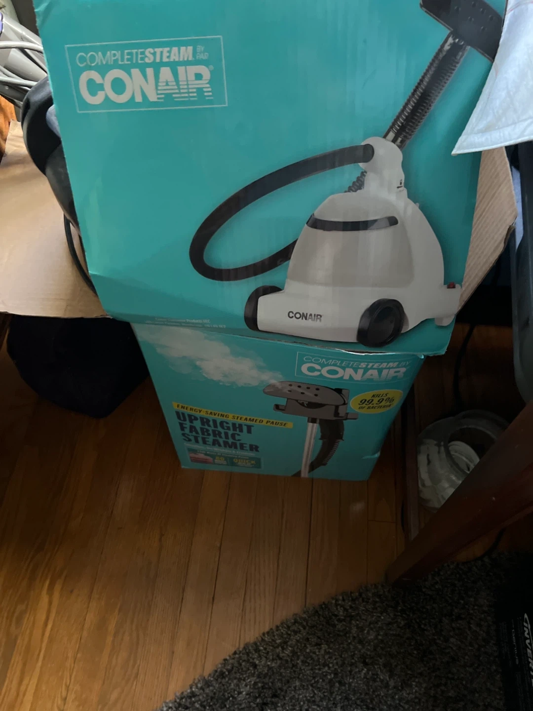 Selling a Conair CompleteSteam Upright Fabric Steamer. It's designed with an energy-saving steamed pause feature and kills 99.9% of bacteria. This upright fabric steamer is ready to help keep your fabrics fresh and clean!