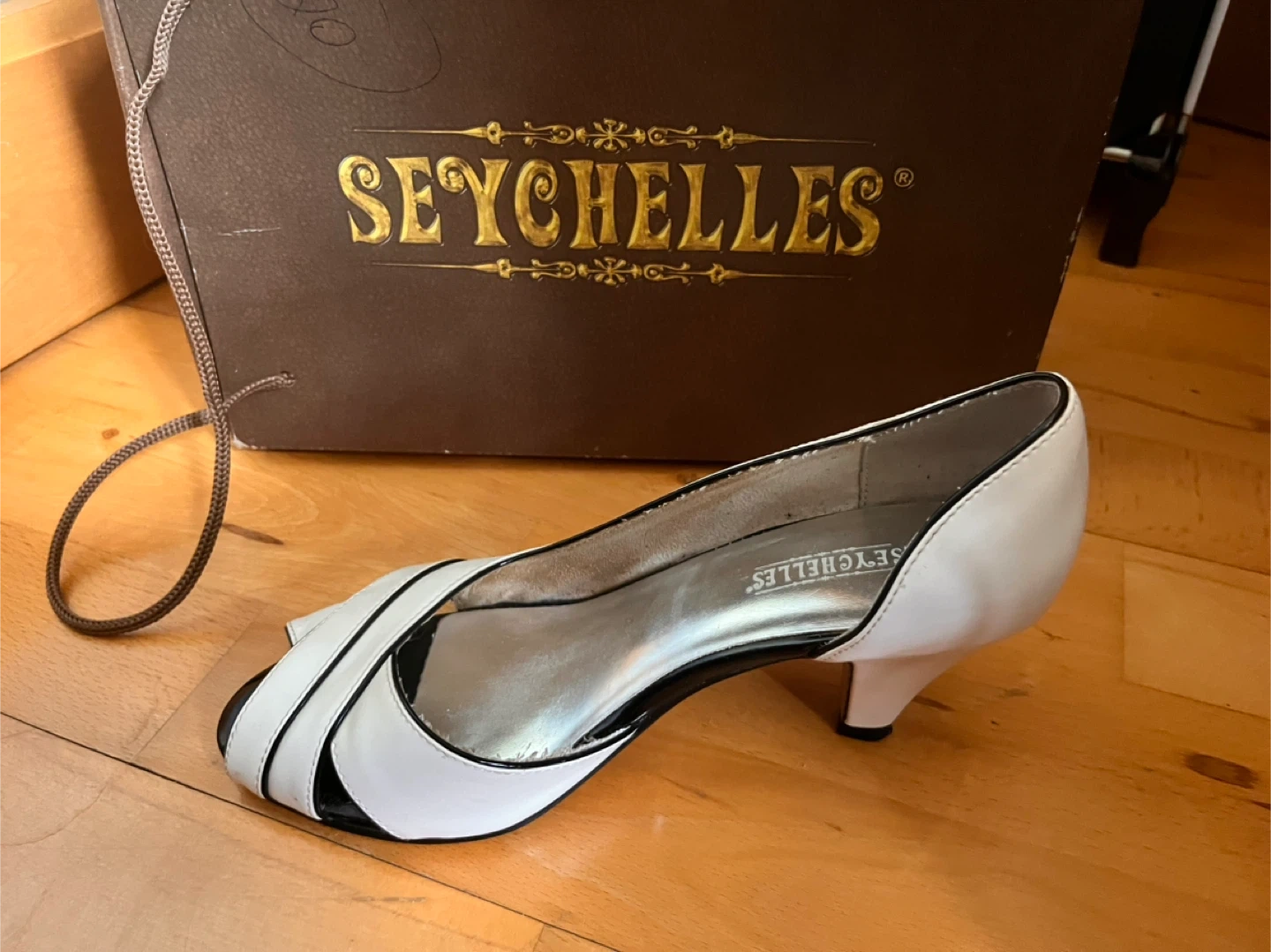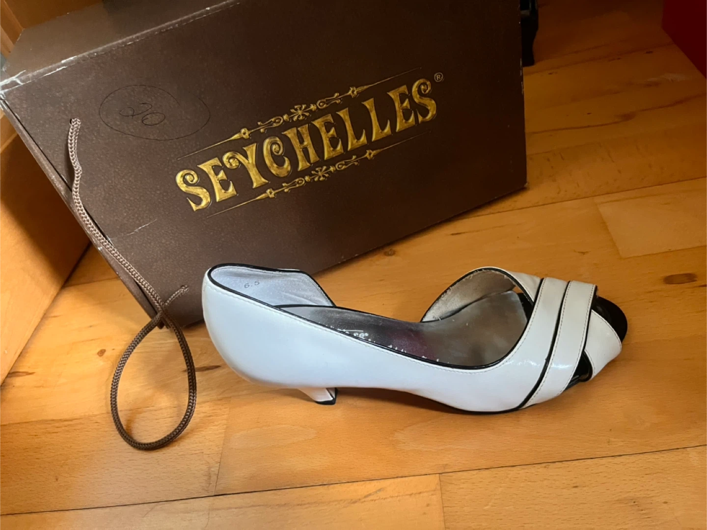 A pair of Seychelles women's heels in white with black accents. Features a peep-toe design and a low heel. Includes original box.