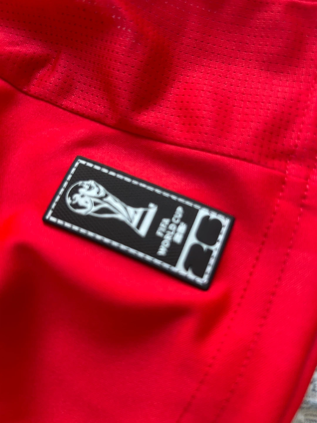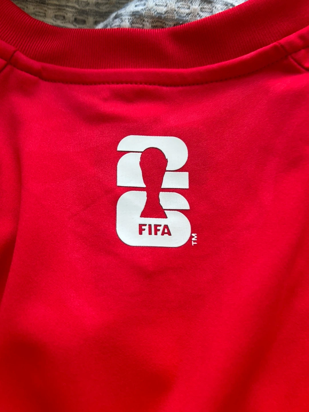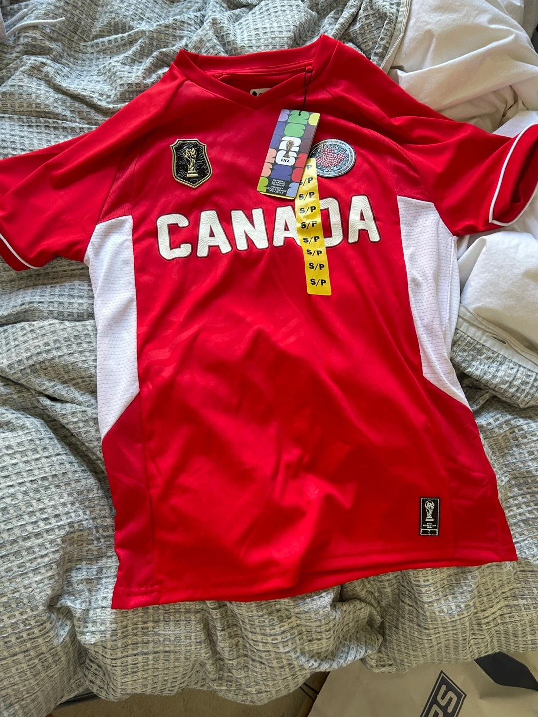 This is a red Canada FIFA World Cup jersey. It's a size small and made of polyester. The jersey features "CANADA" across the front and official FIFA World Cup and FIFA emblems.