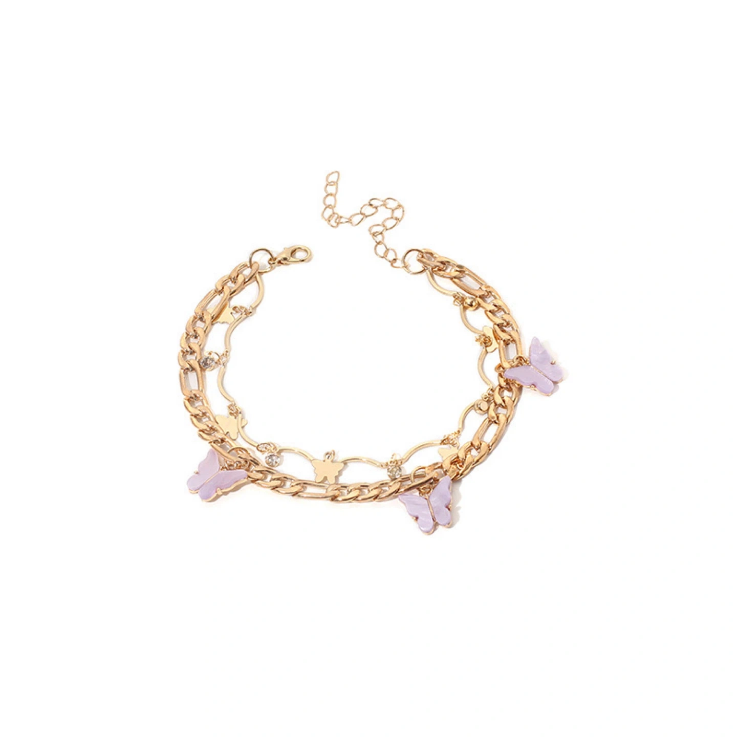 This gold-tone anklet features a double chain design with delicate butterfly charms and small clear accent beads. It's adjustable for a comfortable fit. Adds a touch of charm to any outfit!