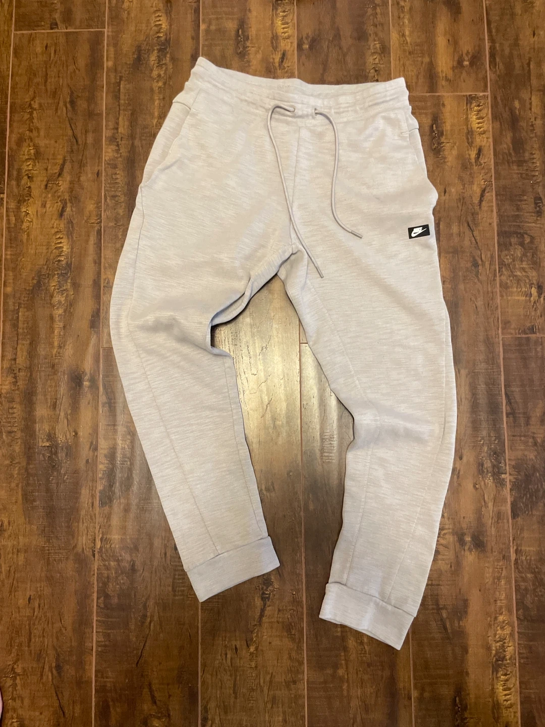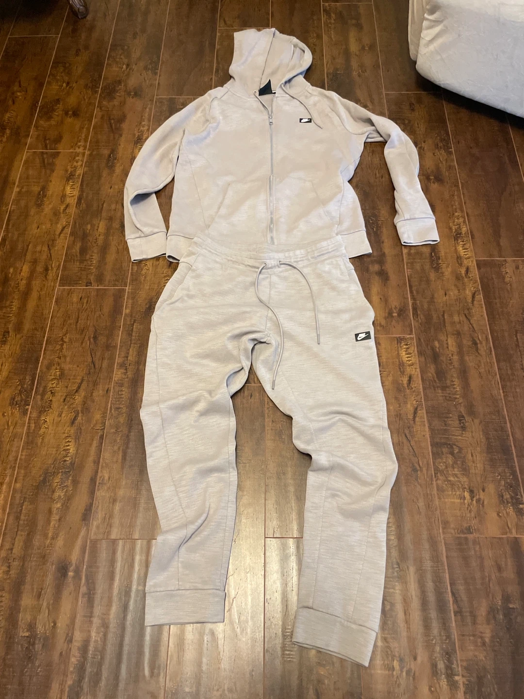 This is a Nike Tech Fleece tracksuit set. It includes a full-zip hoodie and matching jogger pants. Both pieces are made from a soft, comfortable fleece material. The set is grey