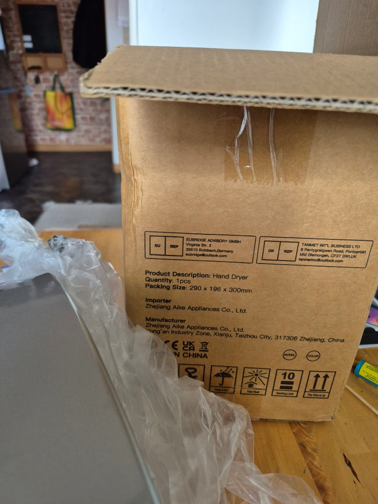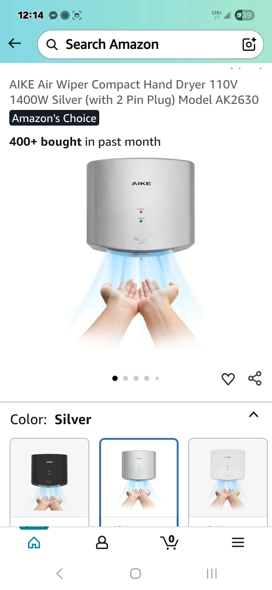 326Selling an AIKE Air Wiper compact hand dryer in silver. It's NEW and comes with the original box and instructions. This model is the AK2630. It's a 110V, 1400W unit with a 2-pin plug. Dries hands quickly in 10-15 seconds with smart-warm wind!