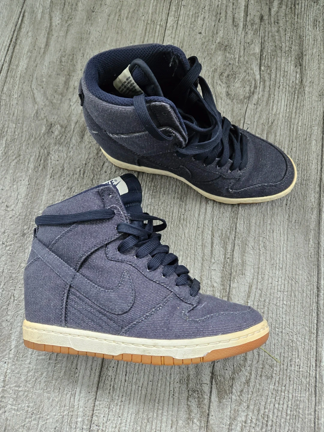 Nike Dunk Sky Hi wedge sneakers in a dark blue denim-like fabric. These high-top sneakers feature lace-up closure and a hidden wedge heel. They're a stylish blend of athletic and fashion footwear.