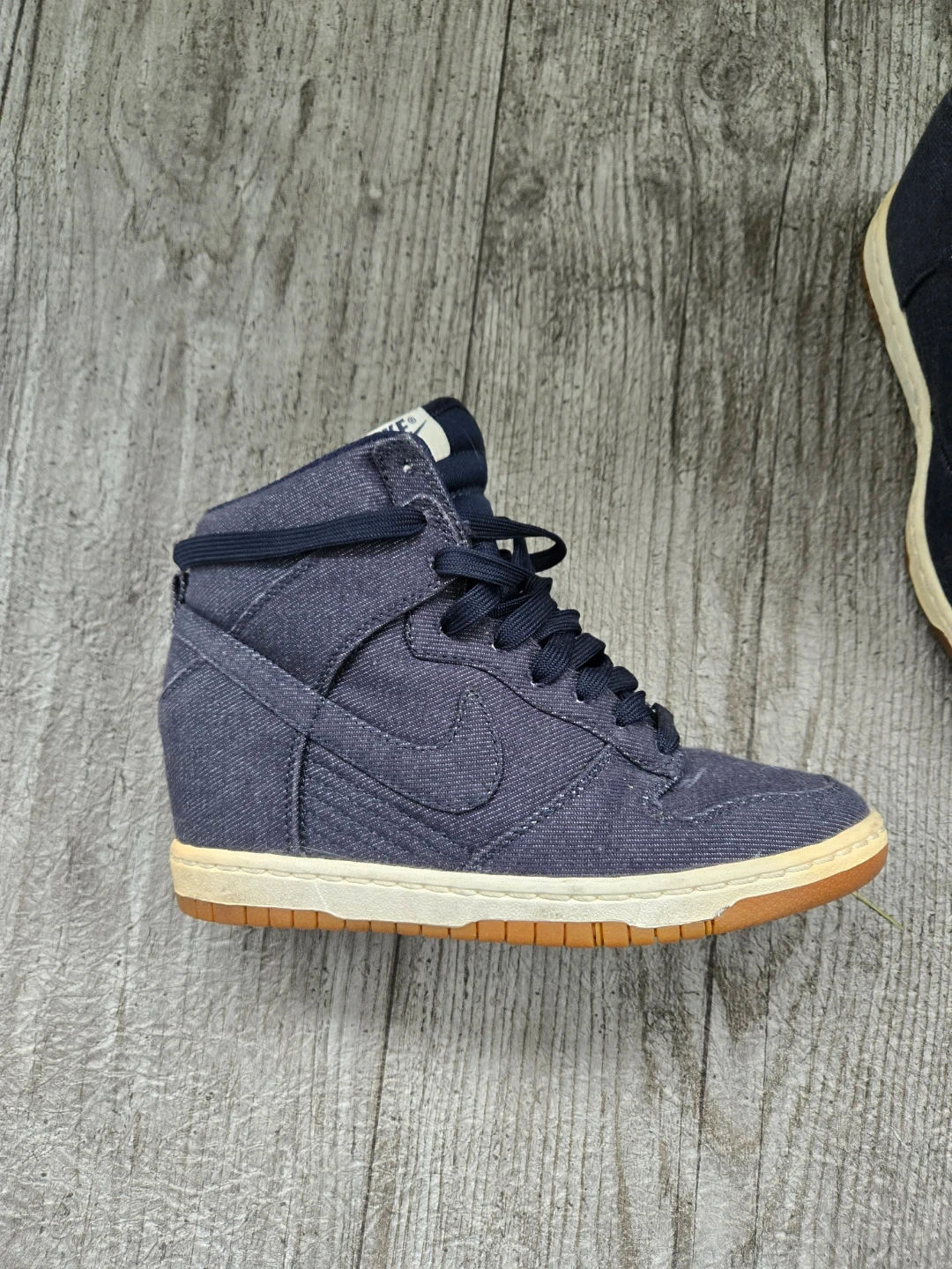 Nike Dunk Sky Hi wedge sneakers in a dark blue denim-like fabric. These high-top sneakers feature lace-up closure and a hidden wedge heel. They're a stylish blend of athletic and fashion footwear.