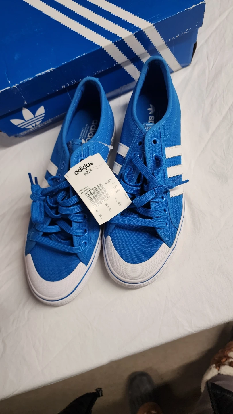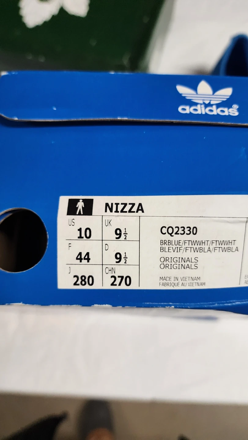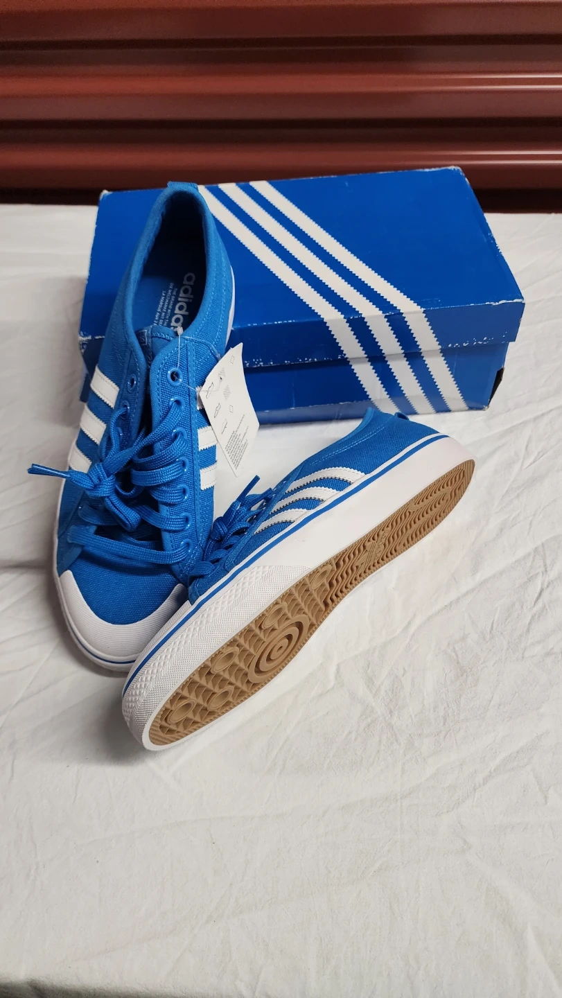 Blue Adidas Nizza low top sneakers. Original box included. Made in Vietnam.
