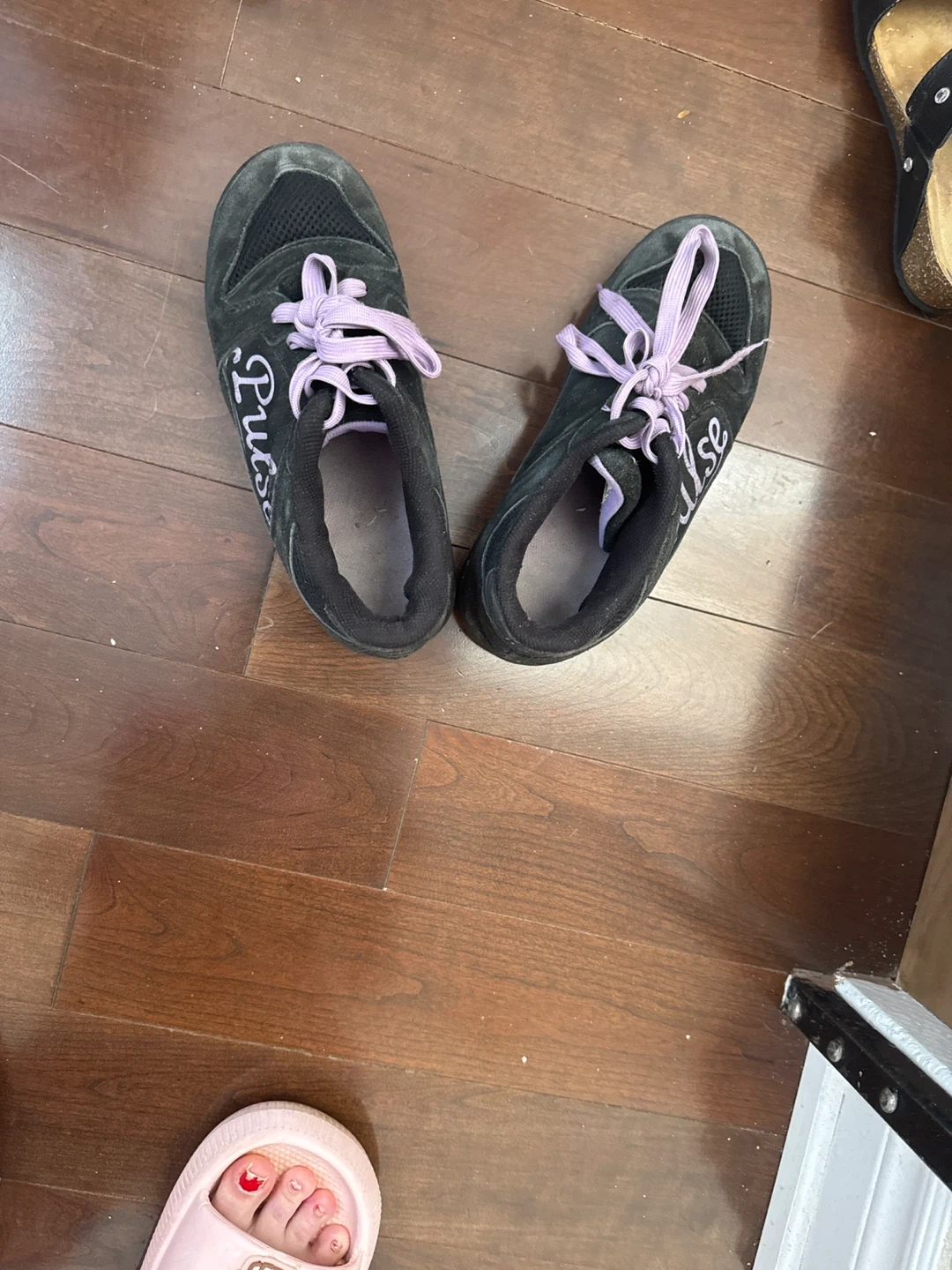 These are black low-top sneakers with "Pulse" written on the sides in white lettering. They have light purple laces. Suede and mesh upper with rubber soles.
