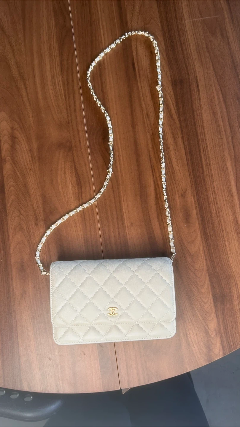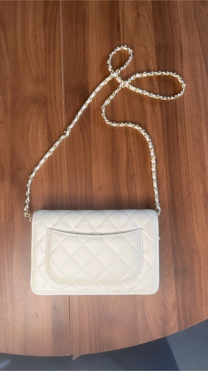 This is a Chanel wallet on chain bag. It's made of caviar leather and features a gold-tone chain strap. The interior has multiple card slots and a zippered compartment.