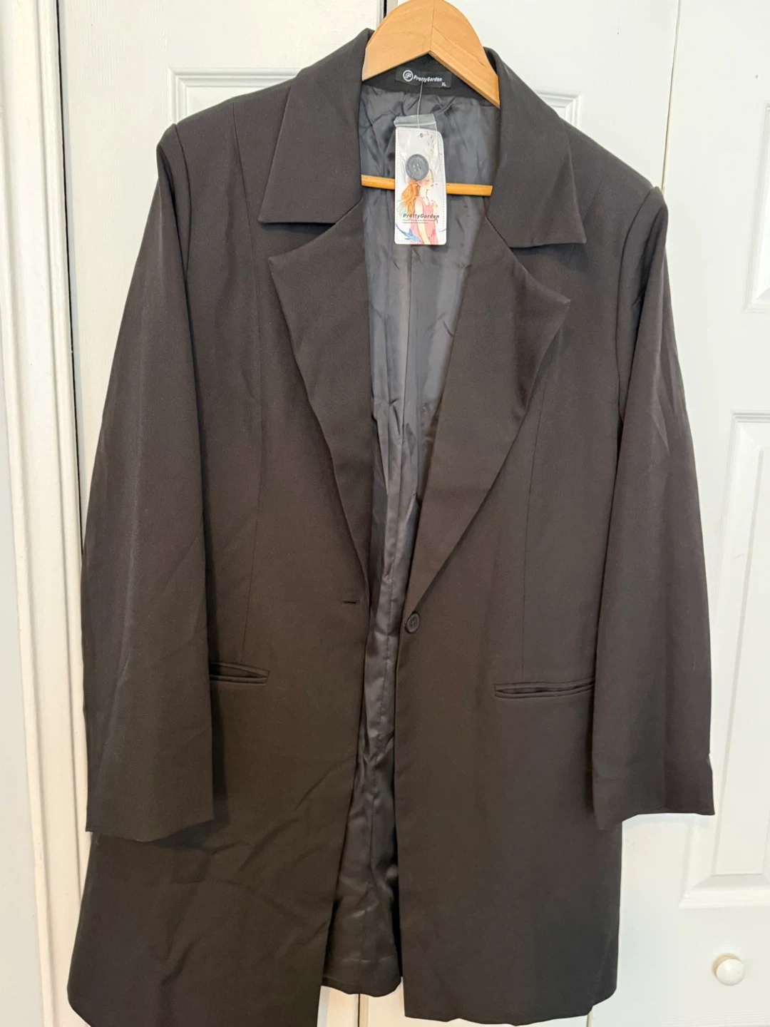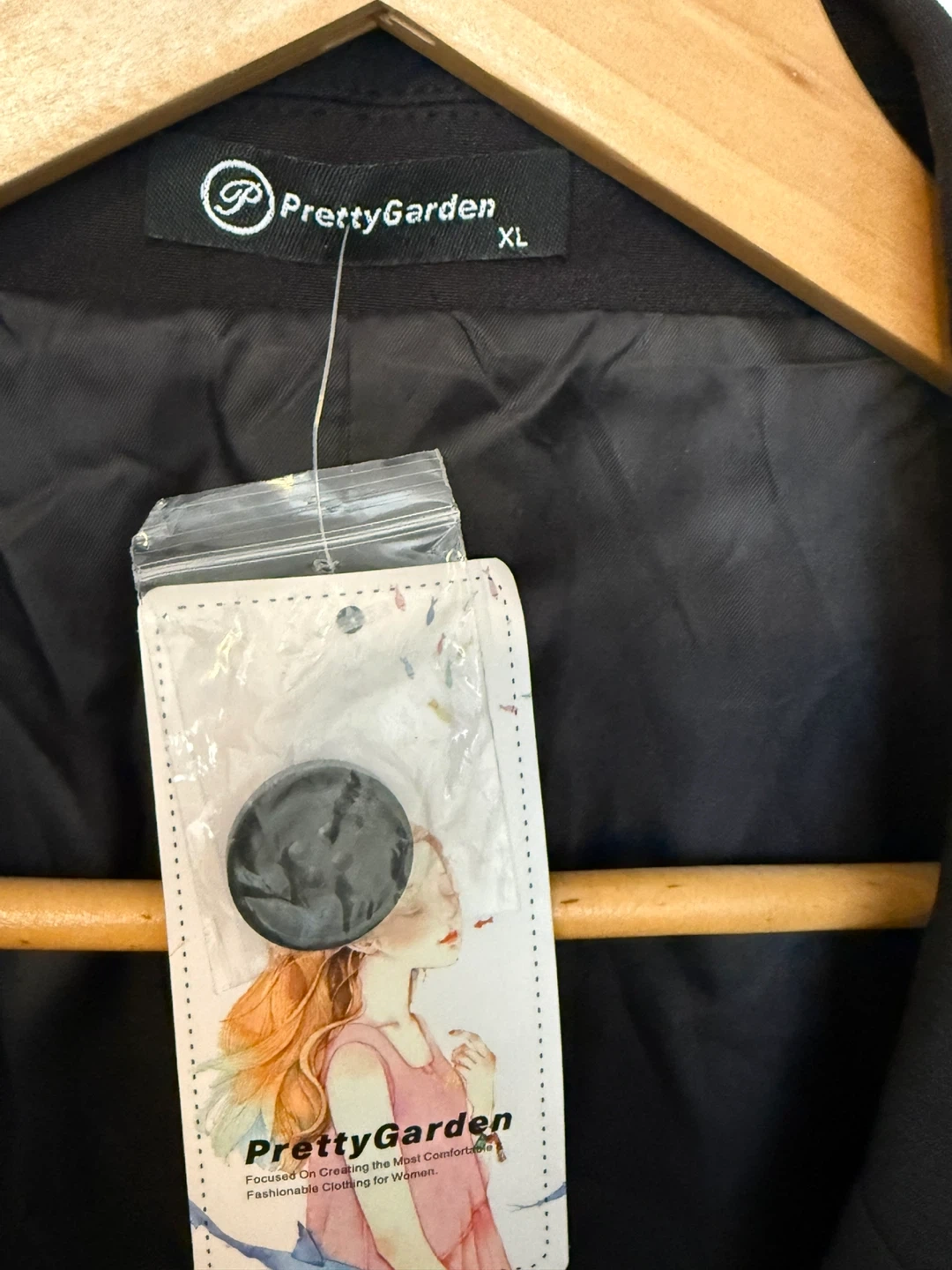 This is a PrettyGarden women's black blazer. It's a size XL. The blazer has a sleek, modern design. It's suitable for both casual and more formal occasions.