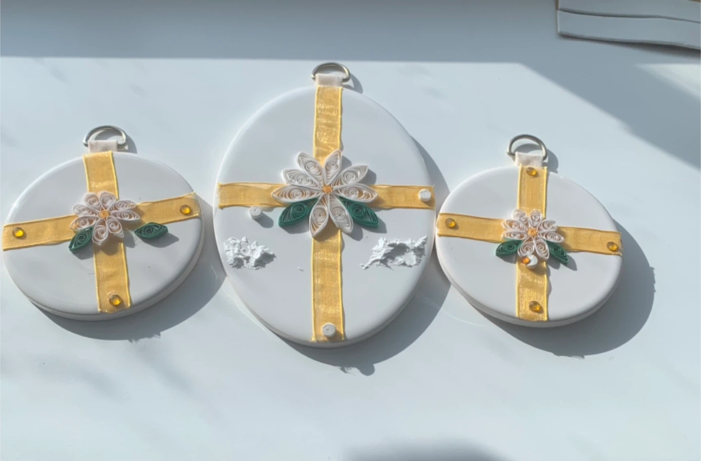 Here are three handmade decorative wall hangings! They feature a white base with a yellow ribbon design and a delicate flower embellishment. Perfect for adding a touch of charm to any room
