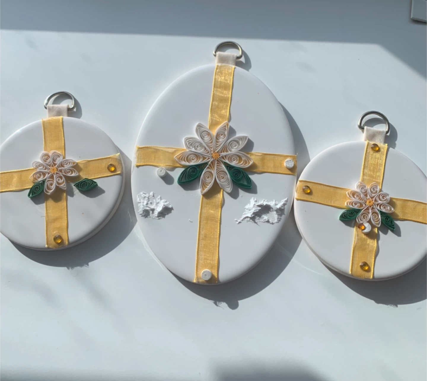Here are three handmade decorative wall hangings! They feature a white base with a yellow ribbon design and a delicate flower embellishment. Perfect for adding a touch of charm to any room