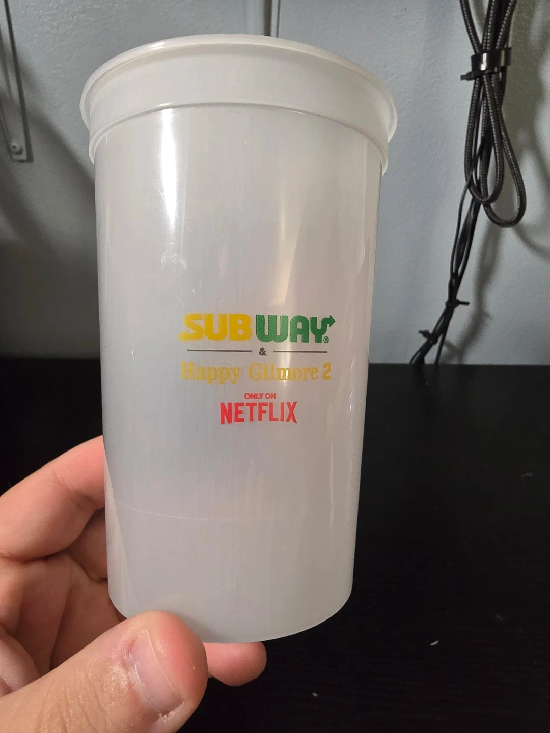 This is a promotional plastic cup from Subway featuring Happy Gilmore 2. It has the Subway logo and "Happy Gilmore 2" printed on it. The cup also shows "ONLY ON NETFLIX."