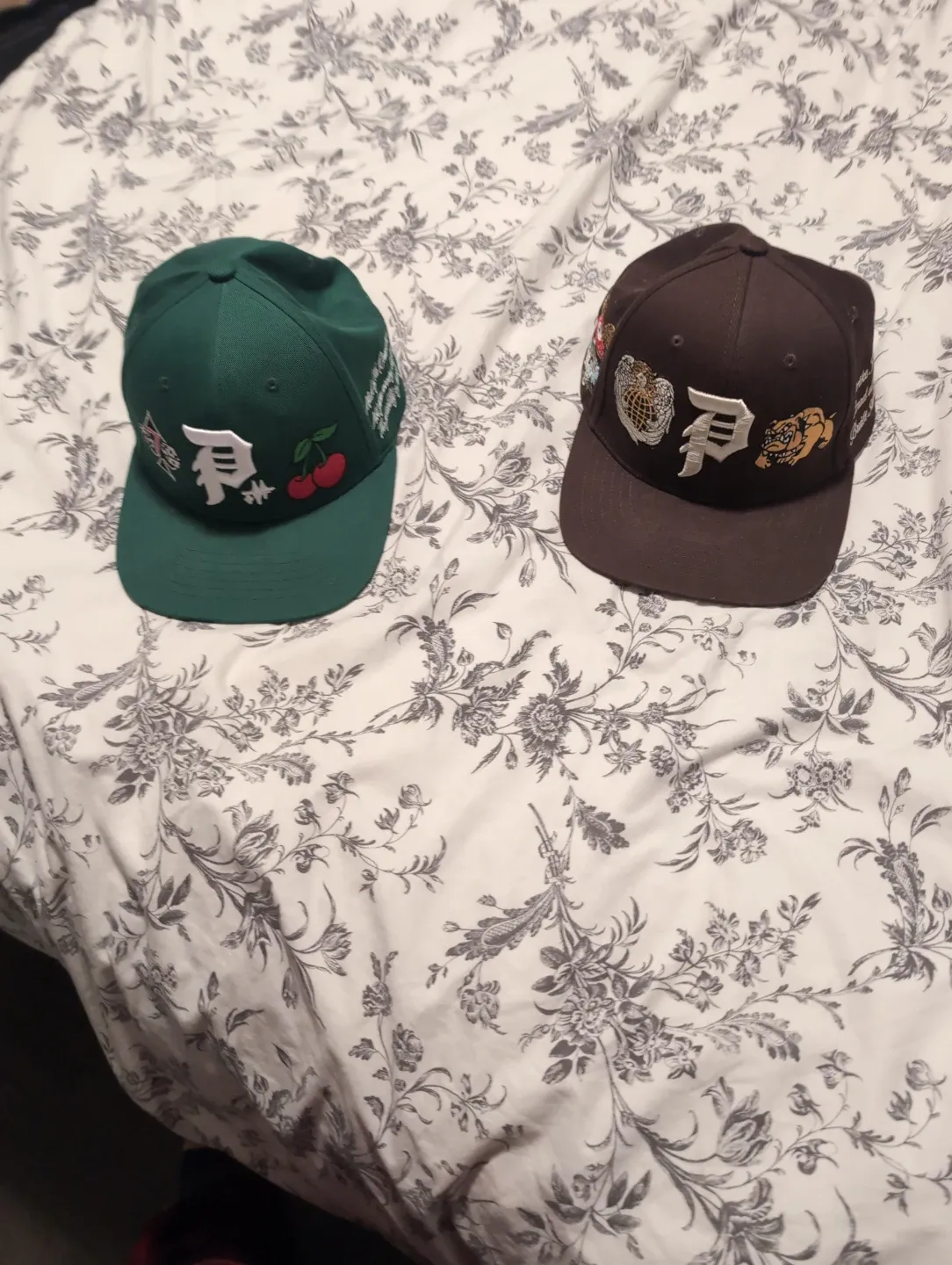 Two Primitive Skateboarding hats for sale! One is green and the other is brown. Both have the Primitive logo on the front and some other cool designs. They're in great condition and ready for a new owner