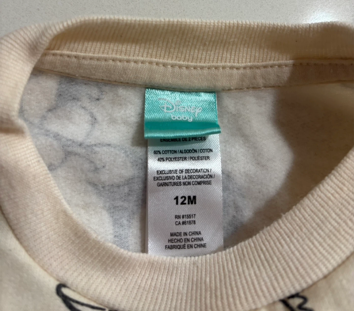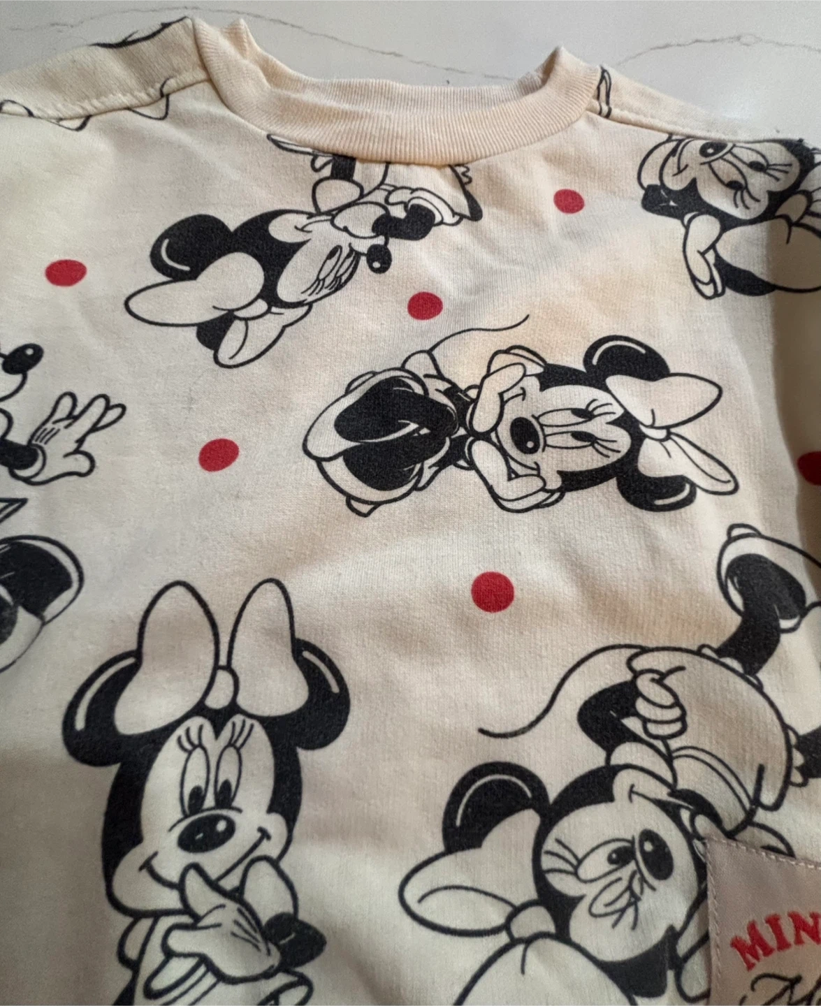 Cream-coloured Disney baby sweatshirt featuring a Minnie Mouse print. It's made from 60% cotton and 40% polyester. Size 12 months.