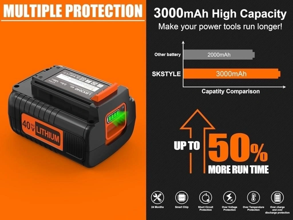 Selling a Black+Decker 40V Max Lithium battery, model LBX2040. It's designed to make your power tools run longer with its 3000mAh high capacity. The battery also has multiple protection features, including smart chip, short circuit protection, and overcharge/over-discharge protection. It also comes with the box