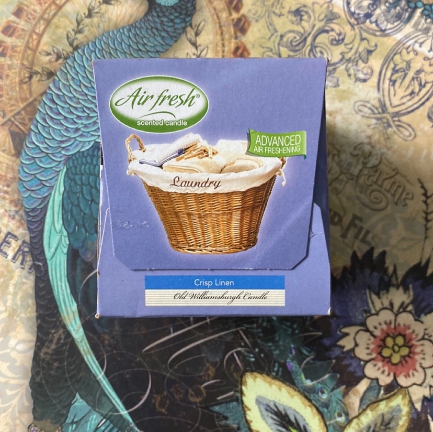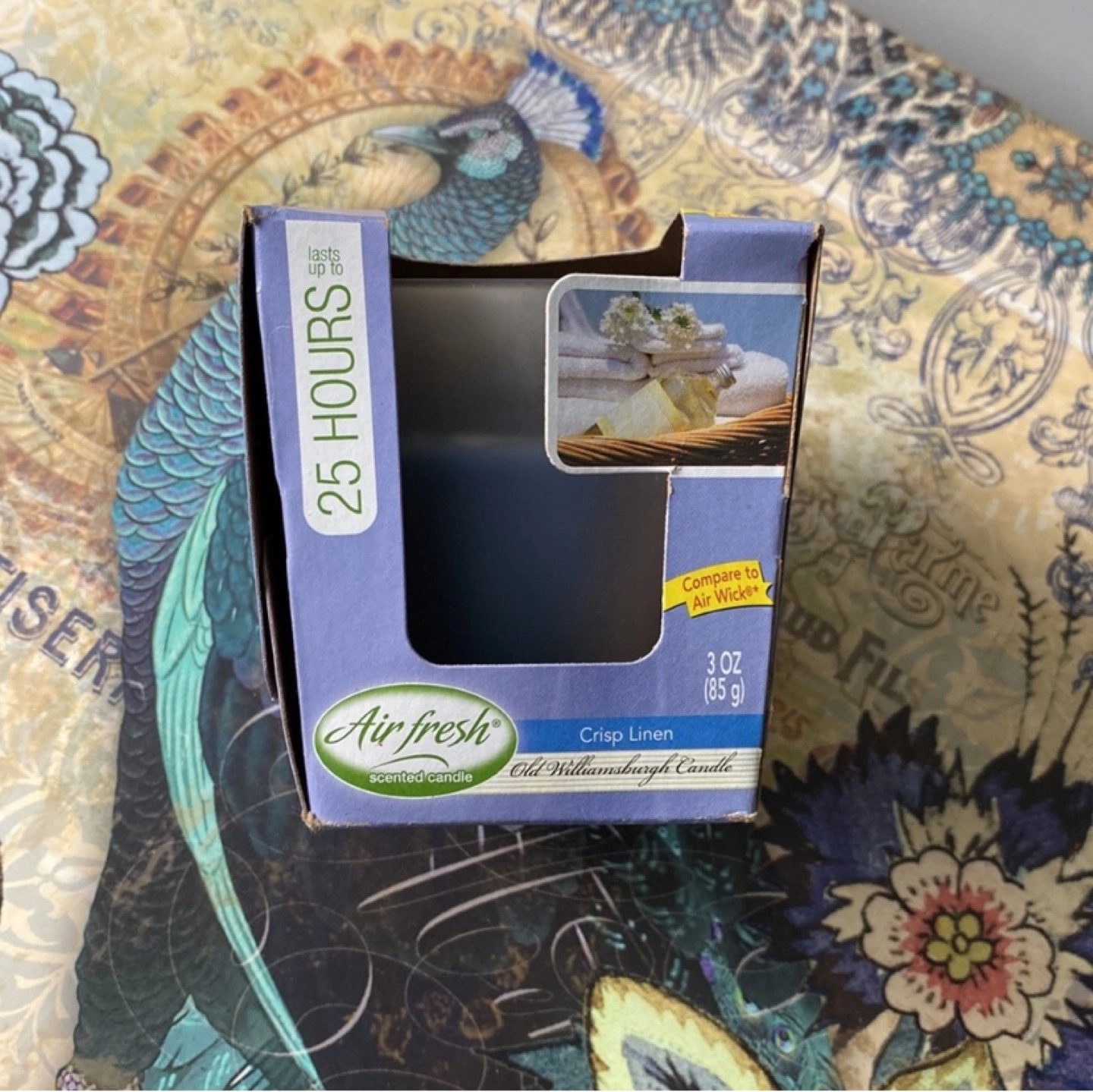 76Old Williamsburg candle, Crisp Linen scent. 3 oz (85 g). Advanced air freshening. Lasts up to 25 hours.