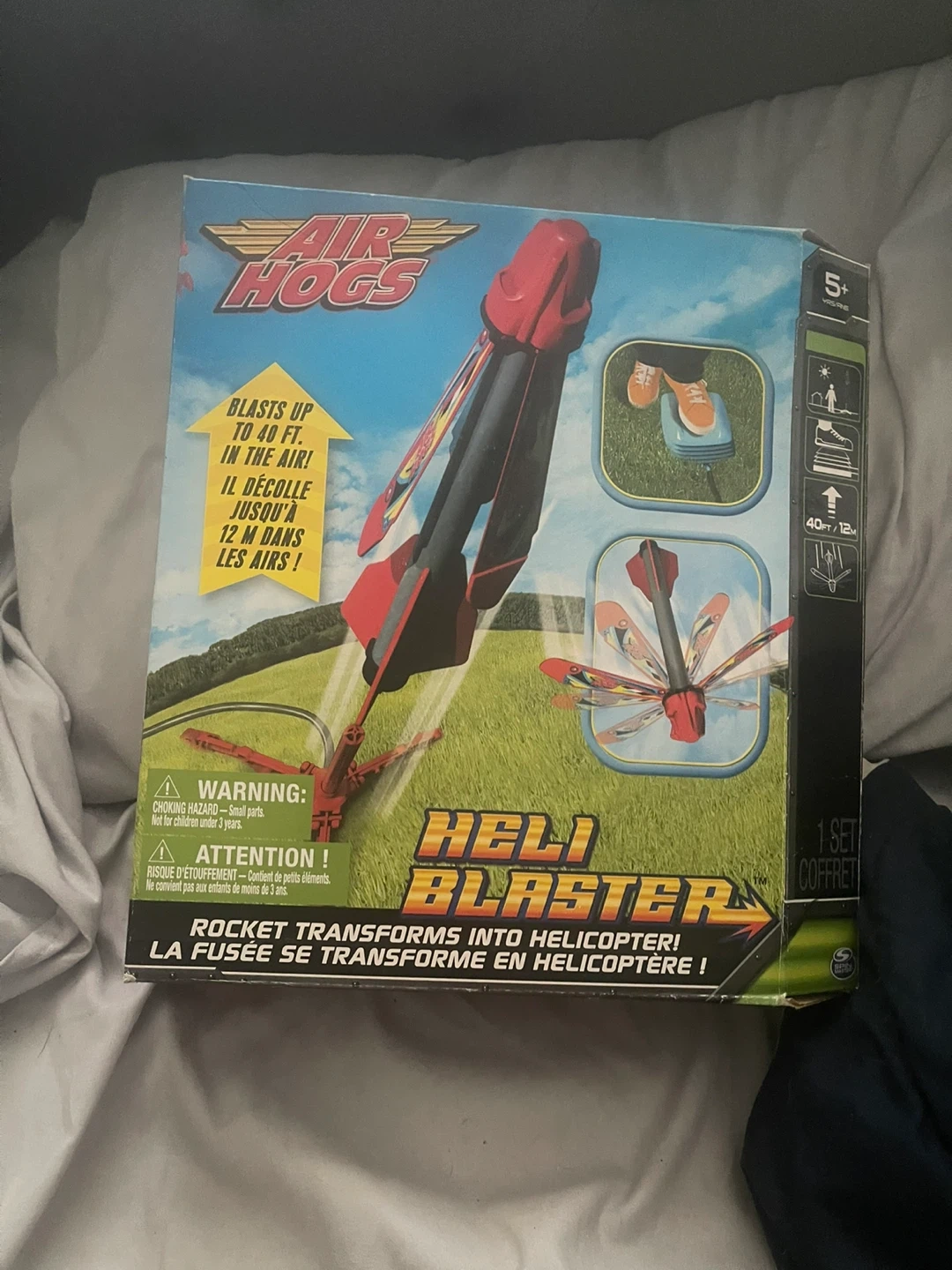 33This Air Hogs Heli Blaster is ready for a new home! It transforms from a rocket into a helicopter and descends. Easy to use and quick to set up. Blasts up to 40 ft in the air! Includes the box