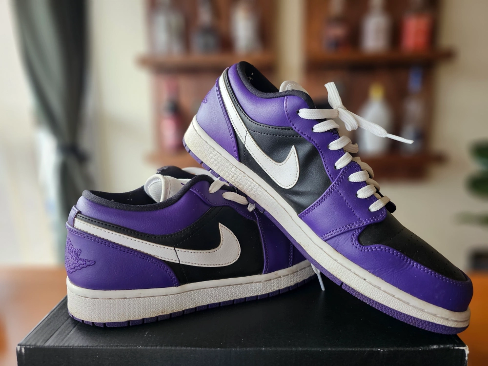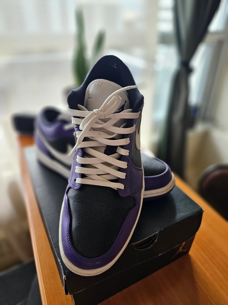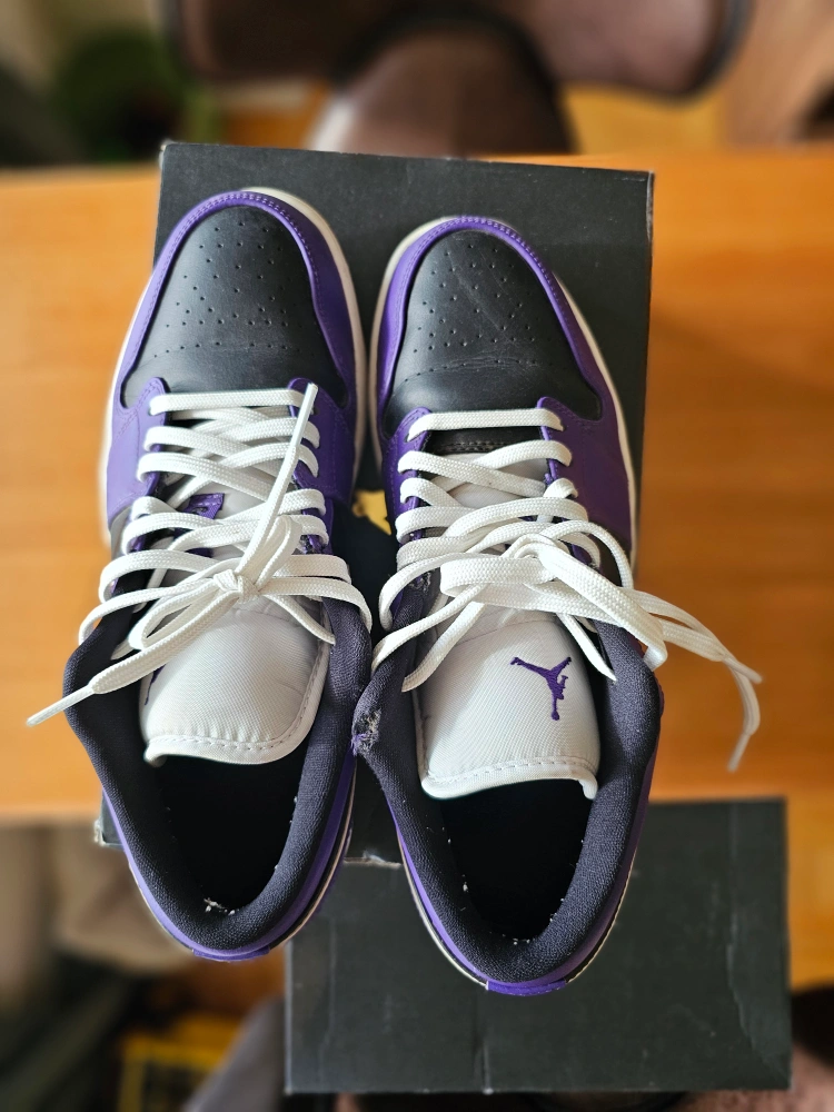 150Air Jordan 1 Low Size 10.5 Purple Used but not abused. Still in great condition except for the small tear on the right pair. (You can see the last photo) Pick Up Victoria Park Ellesmere
