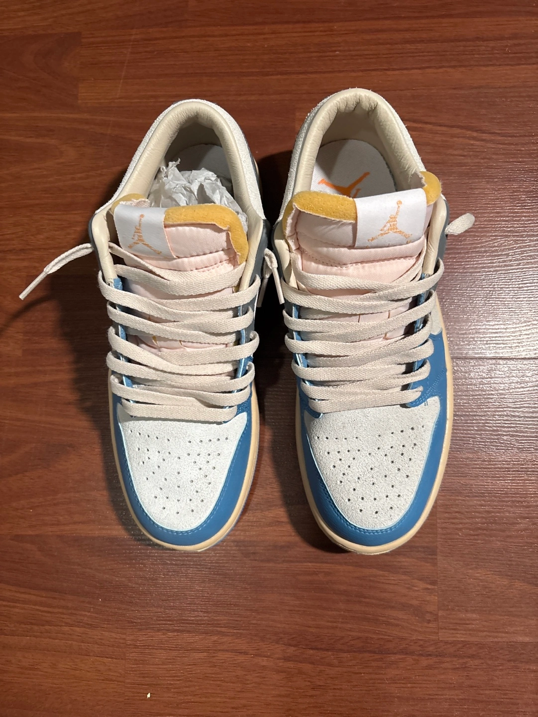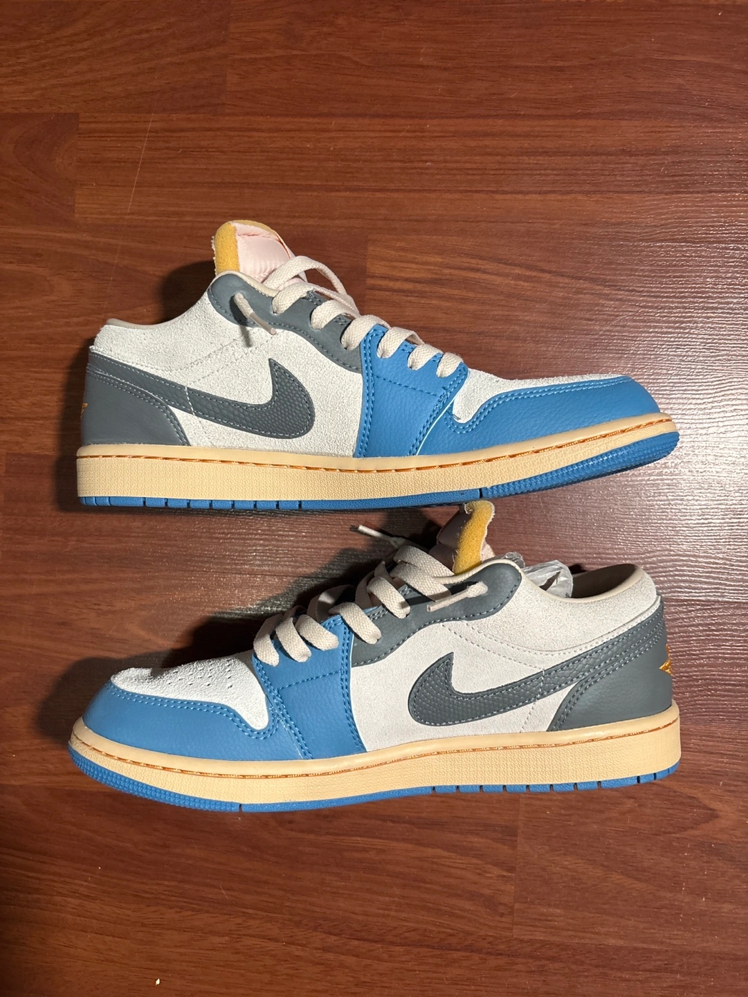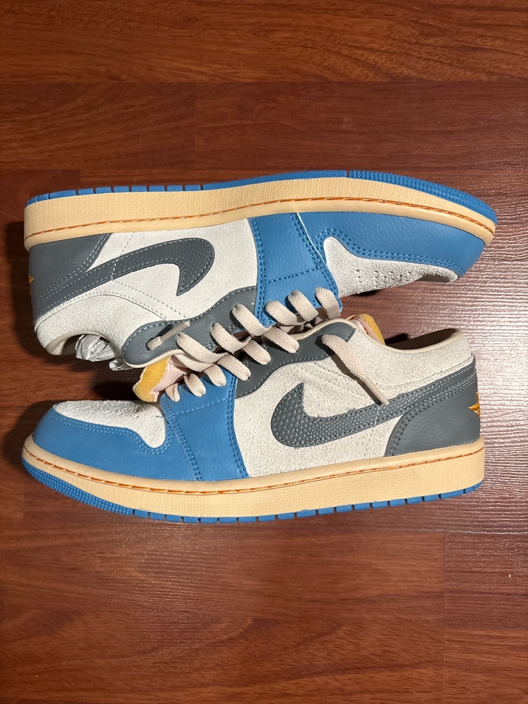 Low-top sneakers. Blue, grey, and off-white colour scheme. Cream laces. Suede and leather upper. Excellent condition with box. Feel free to msg me about the price for questions! I am happy to communicate.