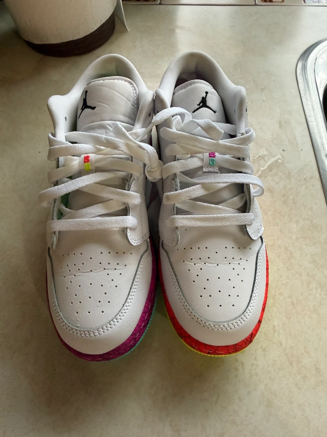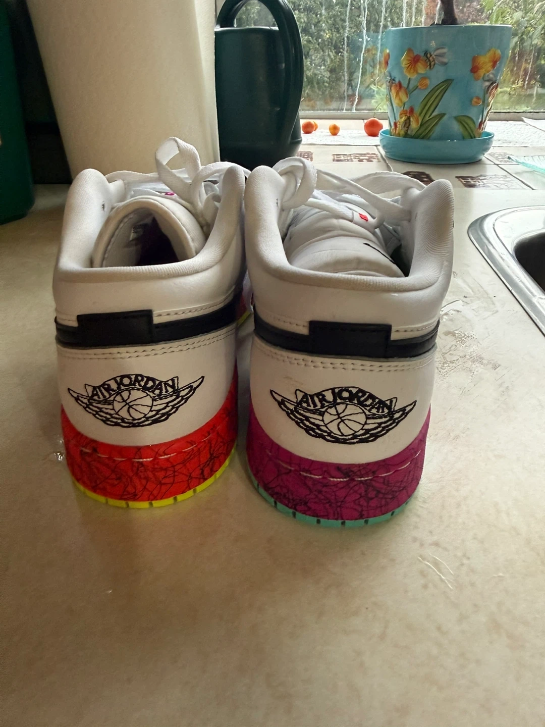 76Selling a pair of Air Jordan 1 Low SE sneakers with a fun mismatched design! These shoes feature a white leather upper with vibrant, contrasting soles and heel accents. The left shoe has a yellow sole and red heel, while the right shoe has a teal sole and purple heel. The iconic Air Jordan logo is prominently displayed on the heel and tongue. These are sure to add a pop of colour to any outfit!