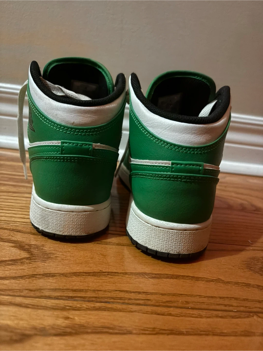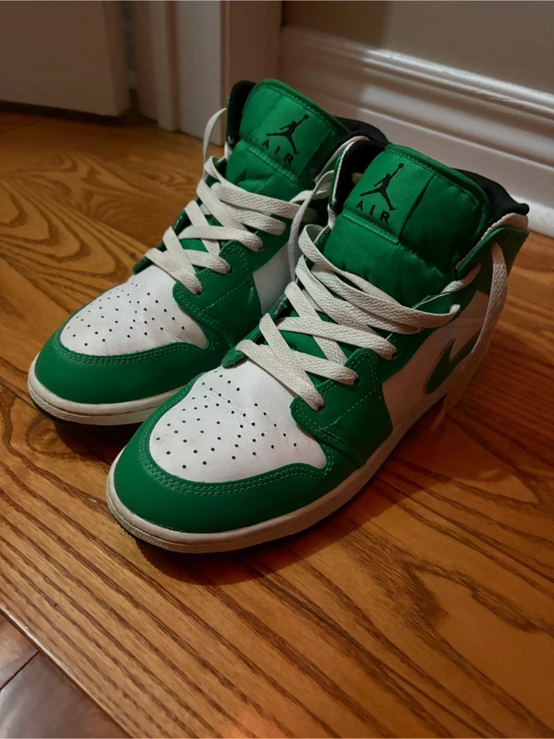 10Selling a pair of Air Jordan 1 Mid in the Lucky Green colourway. They're in good condition and ready for a new home! These shoes are stylish and comfortable, perfect for everyday wear.