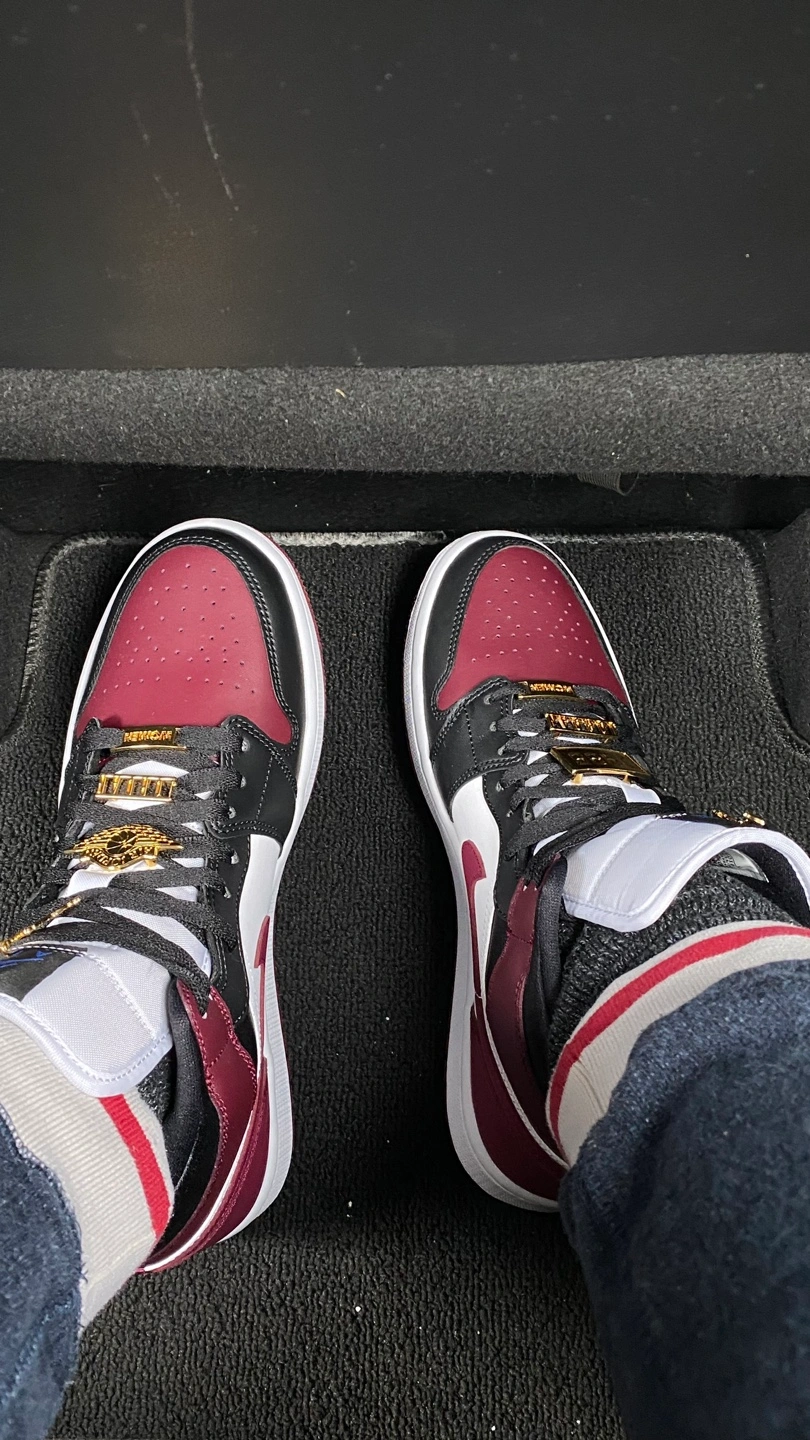 Burgundy, black, and white colourway. Gold pendant accents. Worn a few times, good condition. Complete with box