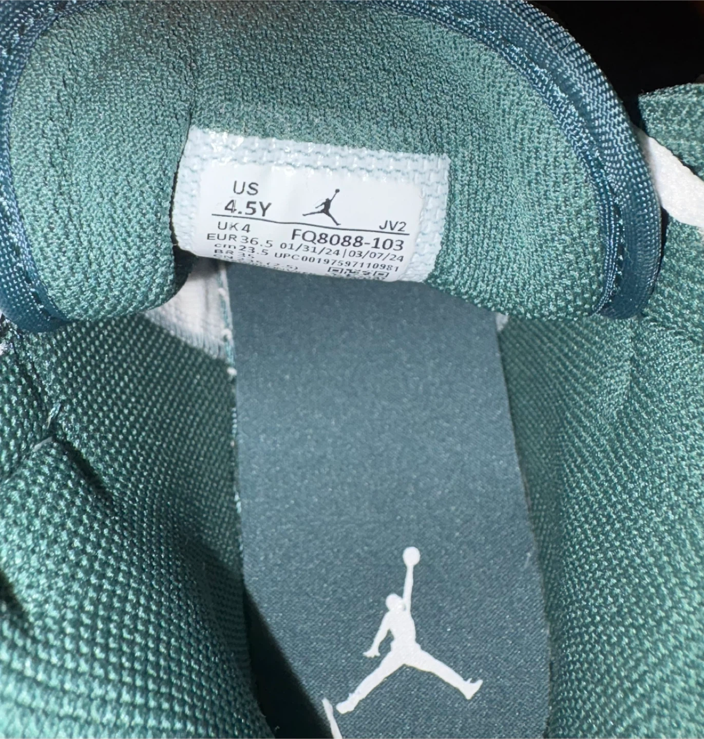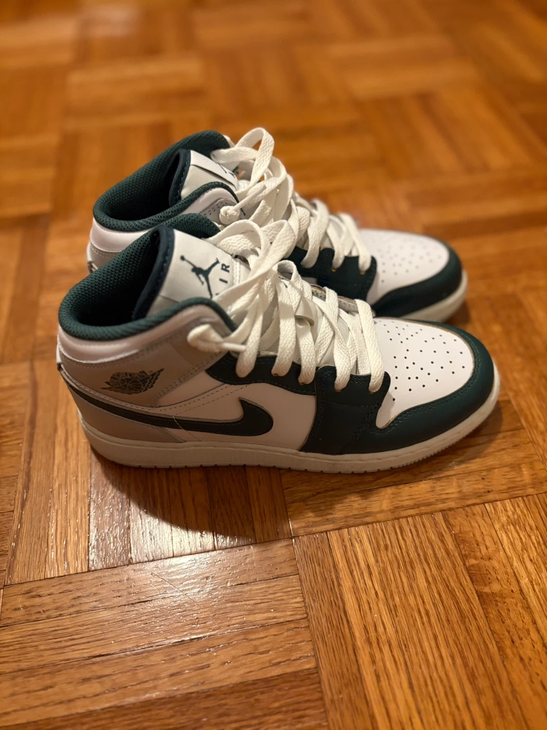 Selling a pair of Air Jordan 1 Mid SE in size 4.5Y. These shoes are in great condition and ready for a new home! The colorway features a mix of white and green, making them a stylish choice for any occasion
