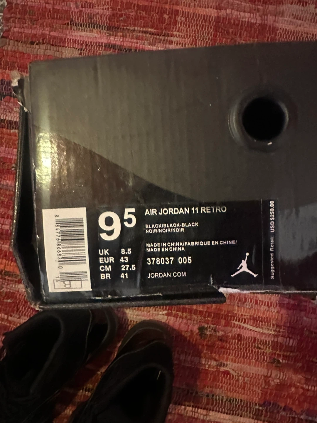75Selling a pair of Air Jordan 11 Retro in black, size 9.5. Comes with the original box. Best offer
