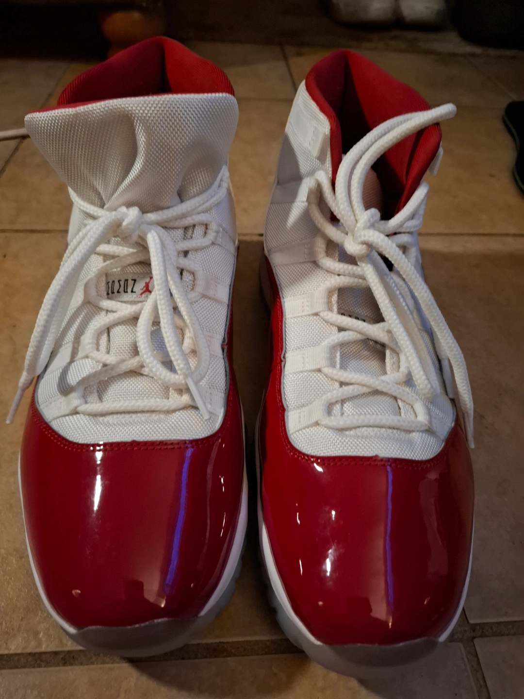 Men's size 13 Air Jordan 11 Retro 'Bred' sneakers. White and red colourway. Patent leather accents. Pre-owned condition.