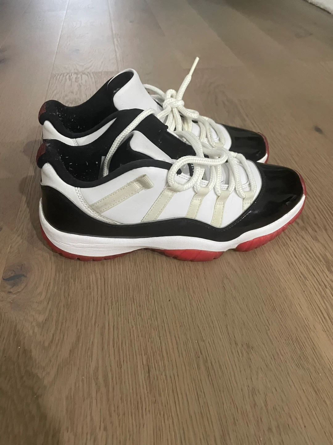 65Selling a pair of Air Jordan 11 Retro shoes. These are in a classic Concord Bred colourway with a black patent leather mudguard, white upper, and red outsole. The shoes feature the iconic Jumpman logo on the heel. Great for collectors or everyday wear!