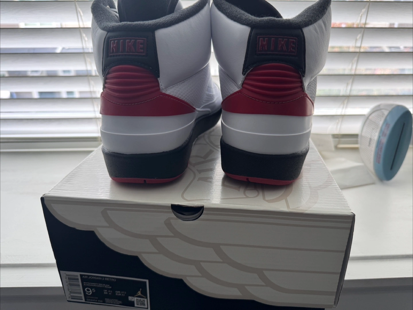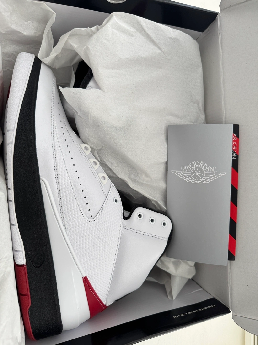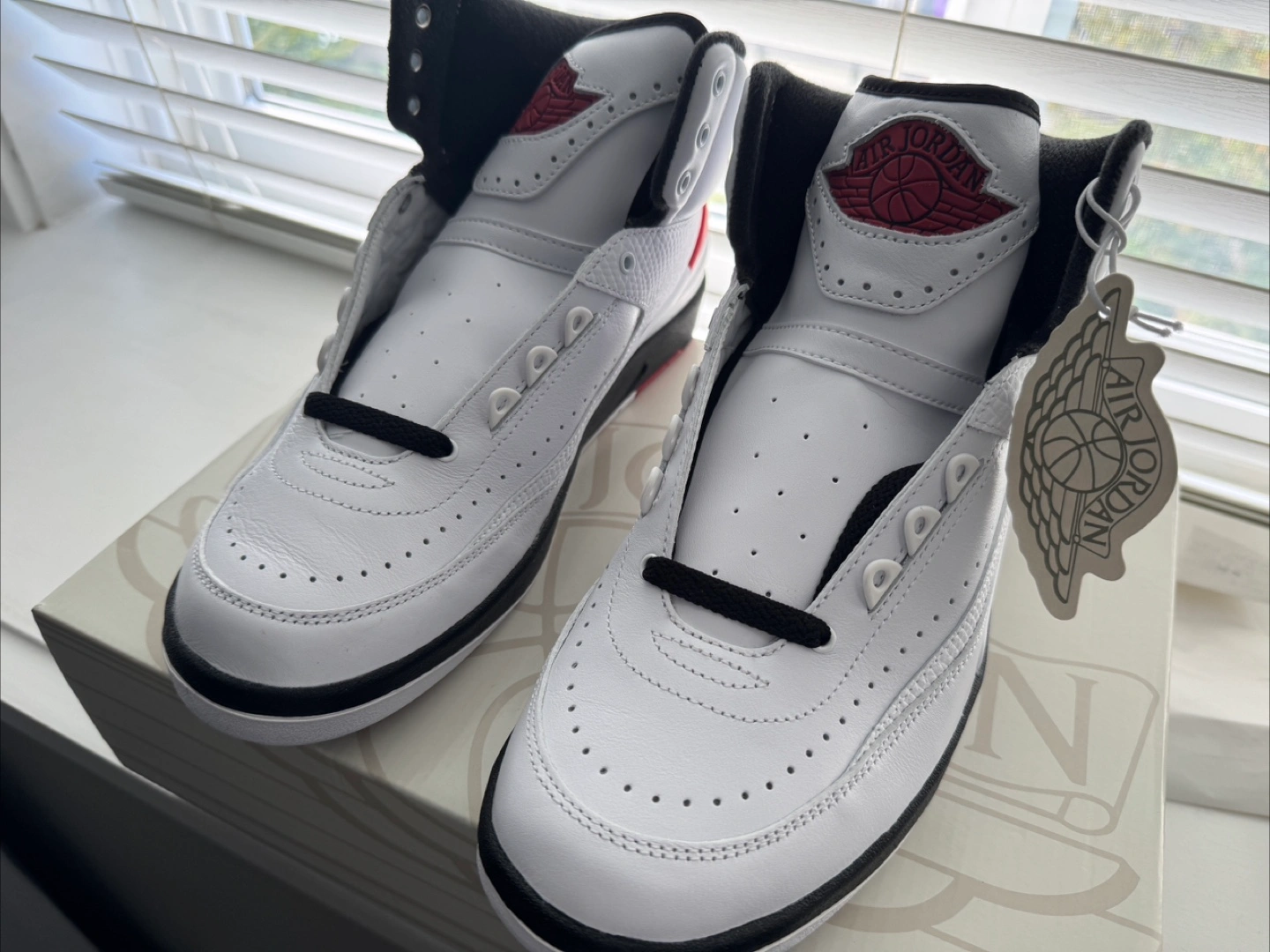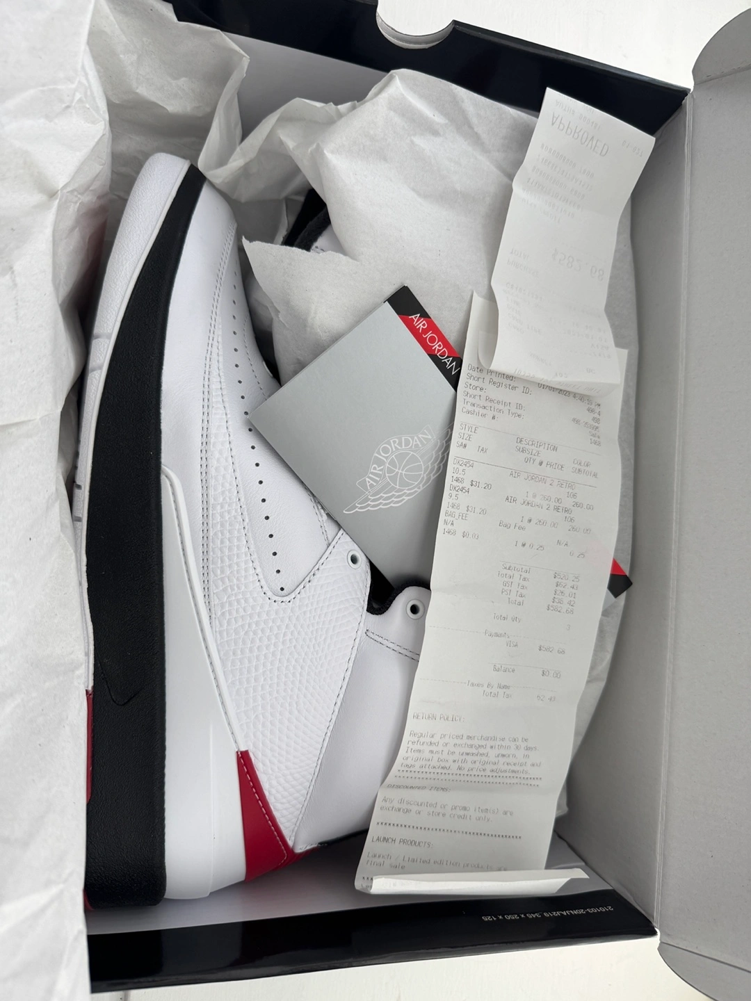 Selling a pair of Air Jordan 2 Retro sneakers in white and red. They are a size 9.5 and come with the original box and receipt. A stylish addition to any sneaker collection!