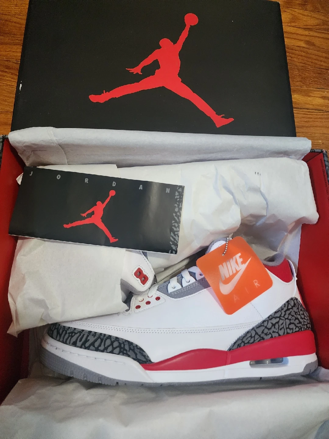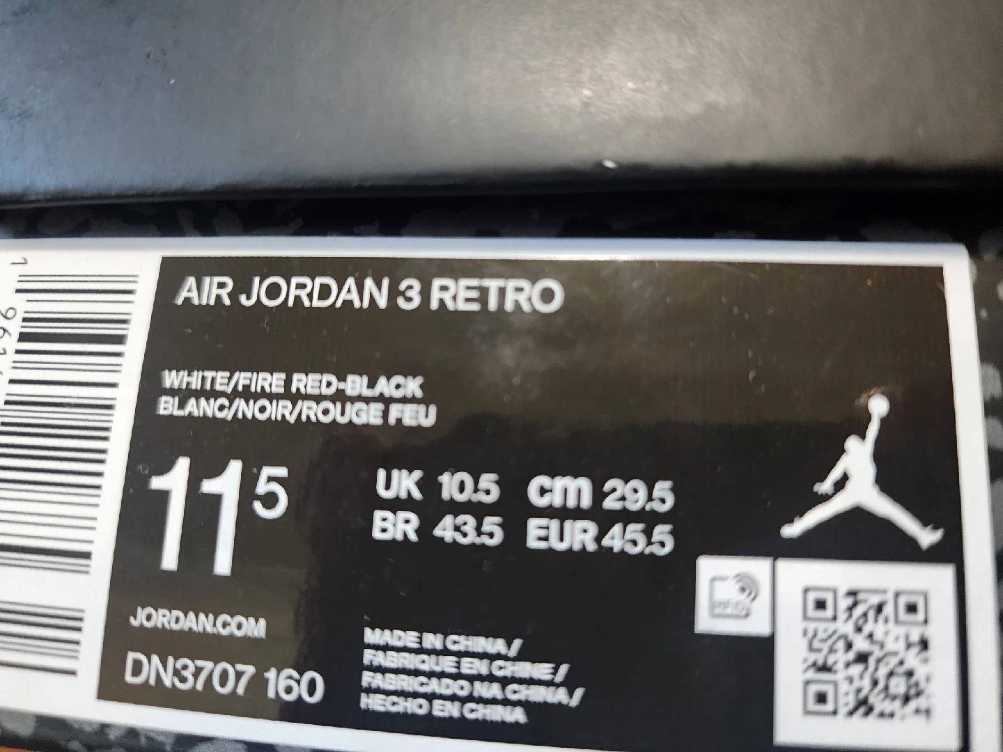 60Selling a pair of Air Jordan 3 Retro sneakers in White/Fire Red/Black, size 11.5 US. These come with the original box and packaging. A classic addition to any sneaker collection! BNIB!