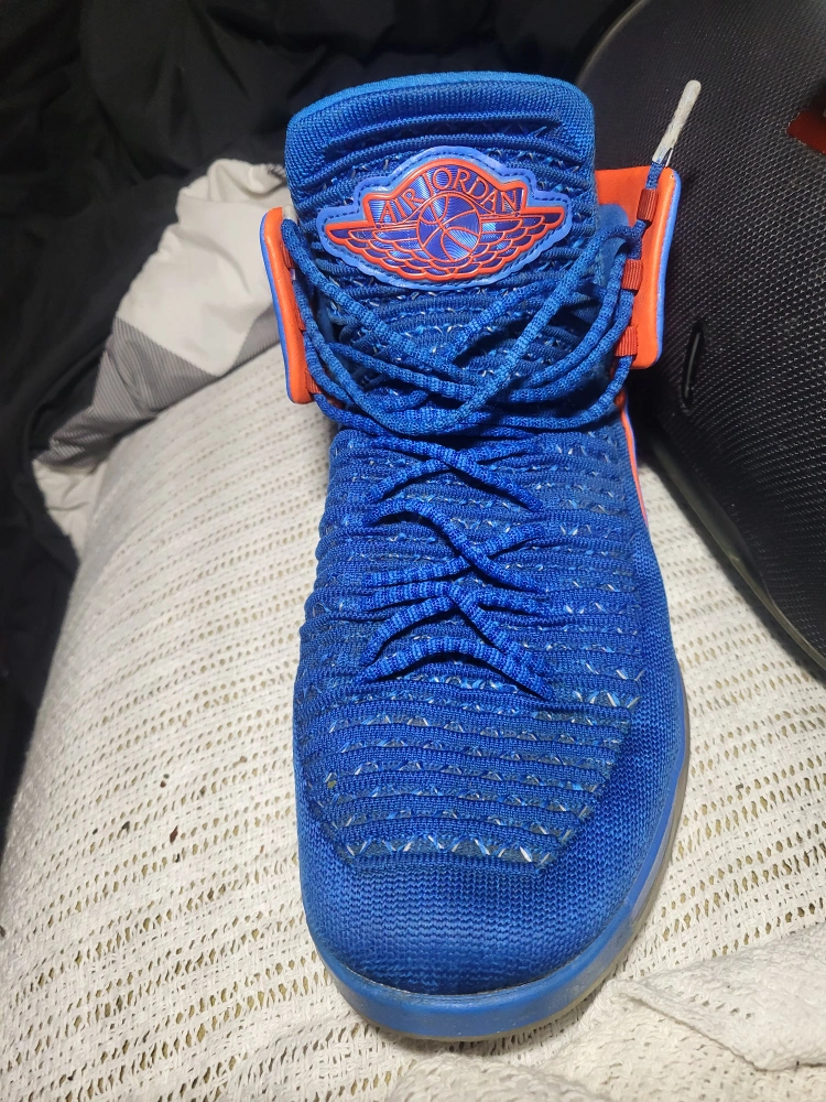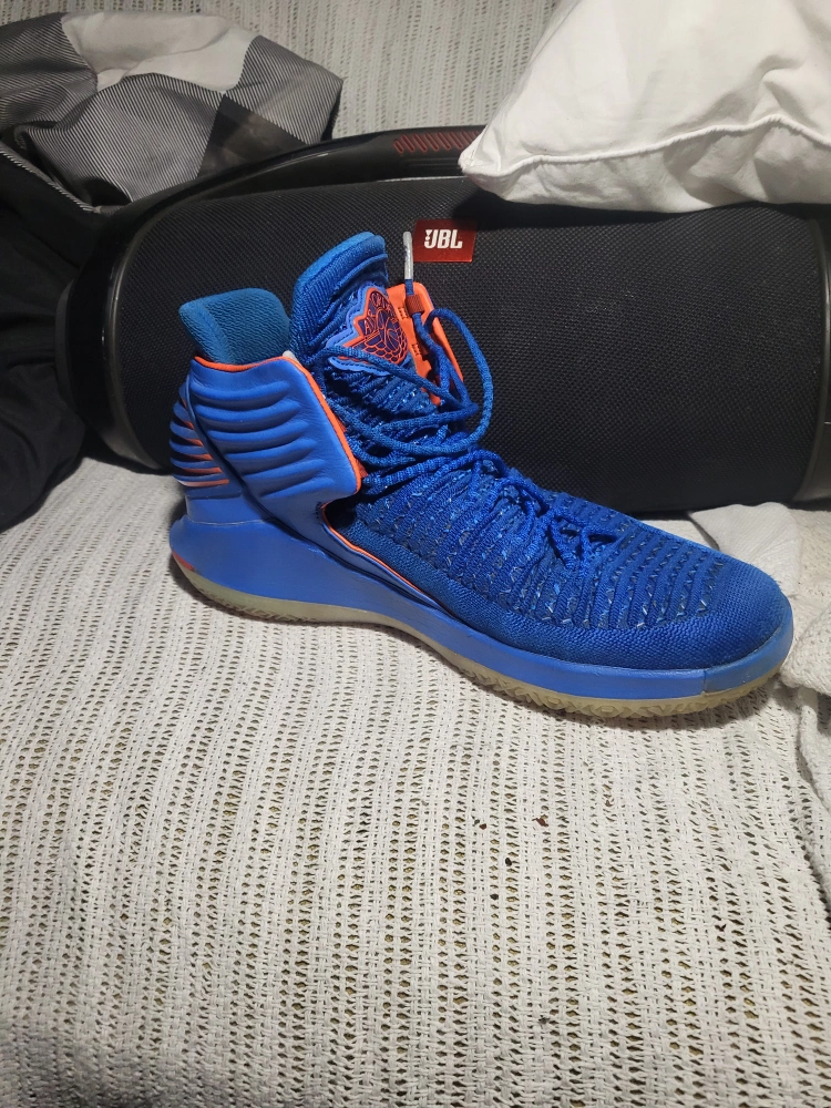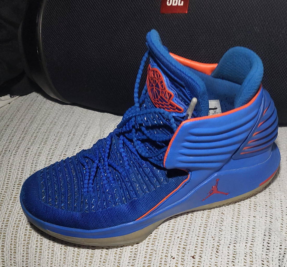 10Selling a pair of Air Jordan 32 in blue and orange. They're in good condition and ready for a new home!