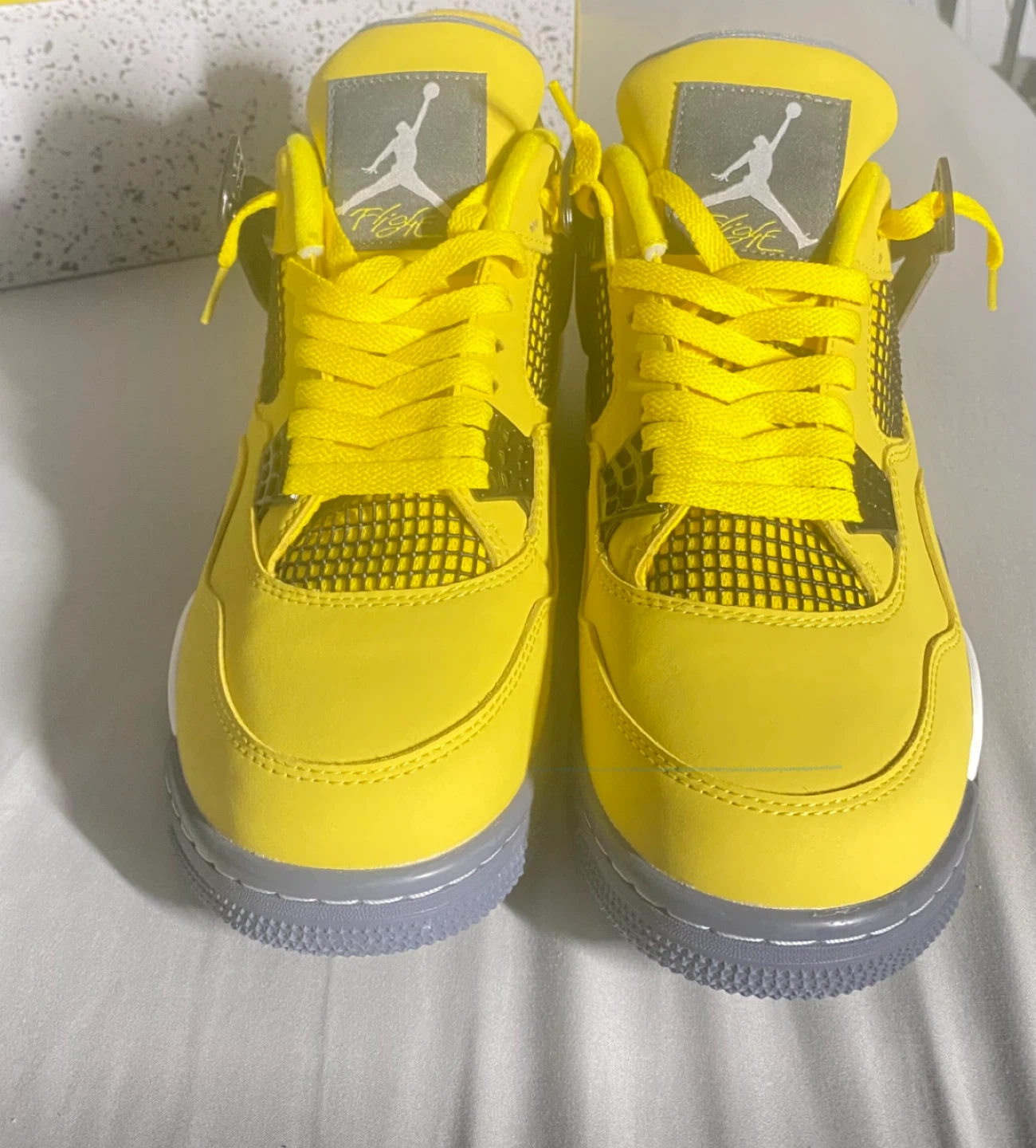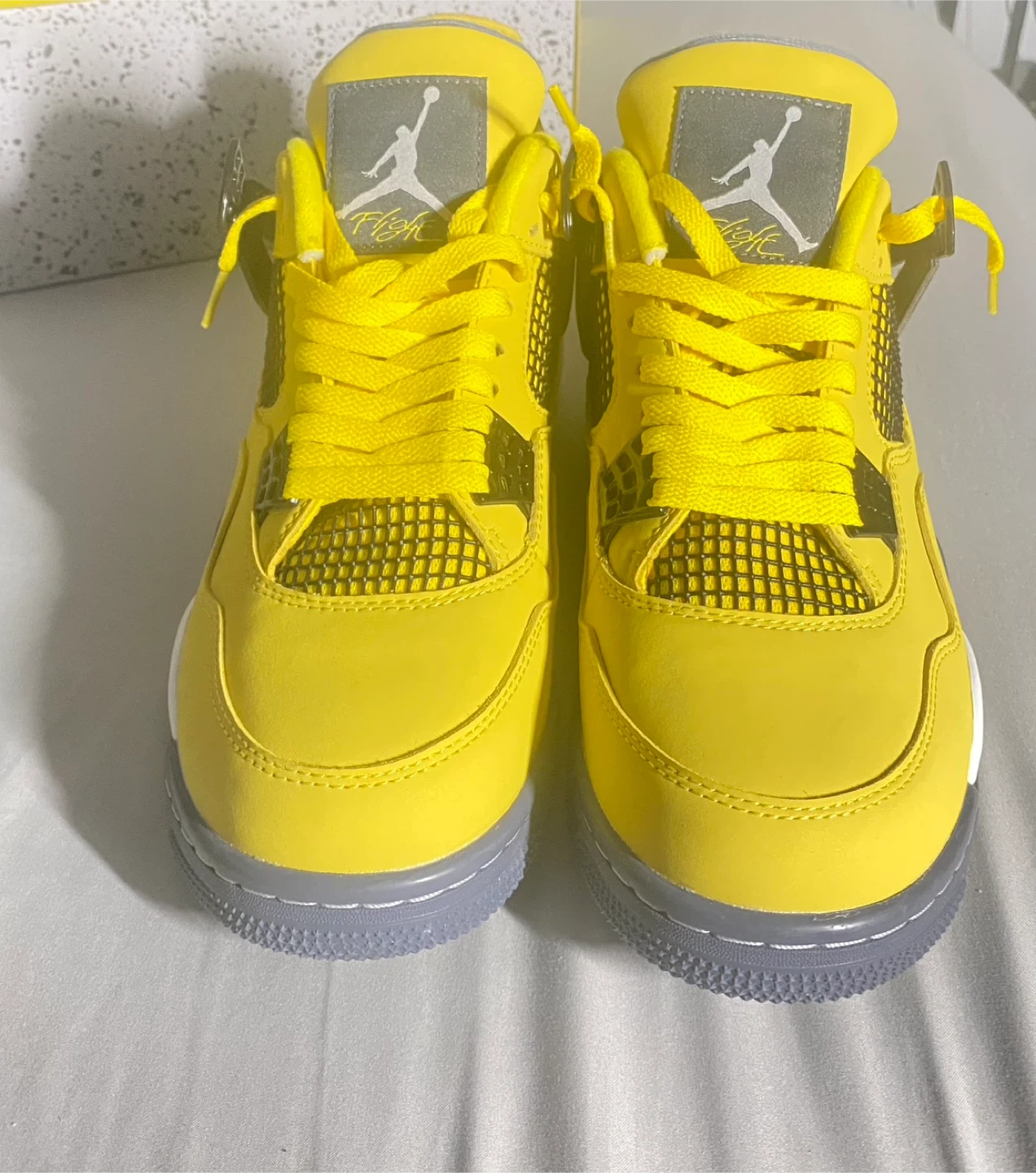 10Get ready to electrify your style with these Air Jordan 4 Retro Lightning sneakers! These iconic kicks feature a vibrant yellow colourway with grey accents, making them a standout addition to any sneaker collection. The shoes come with the original box. Don't miss out on the chance to add these classic Jordans to your wardrobe!