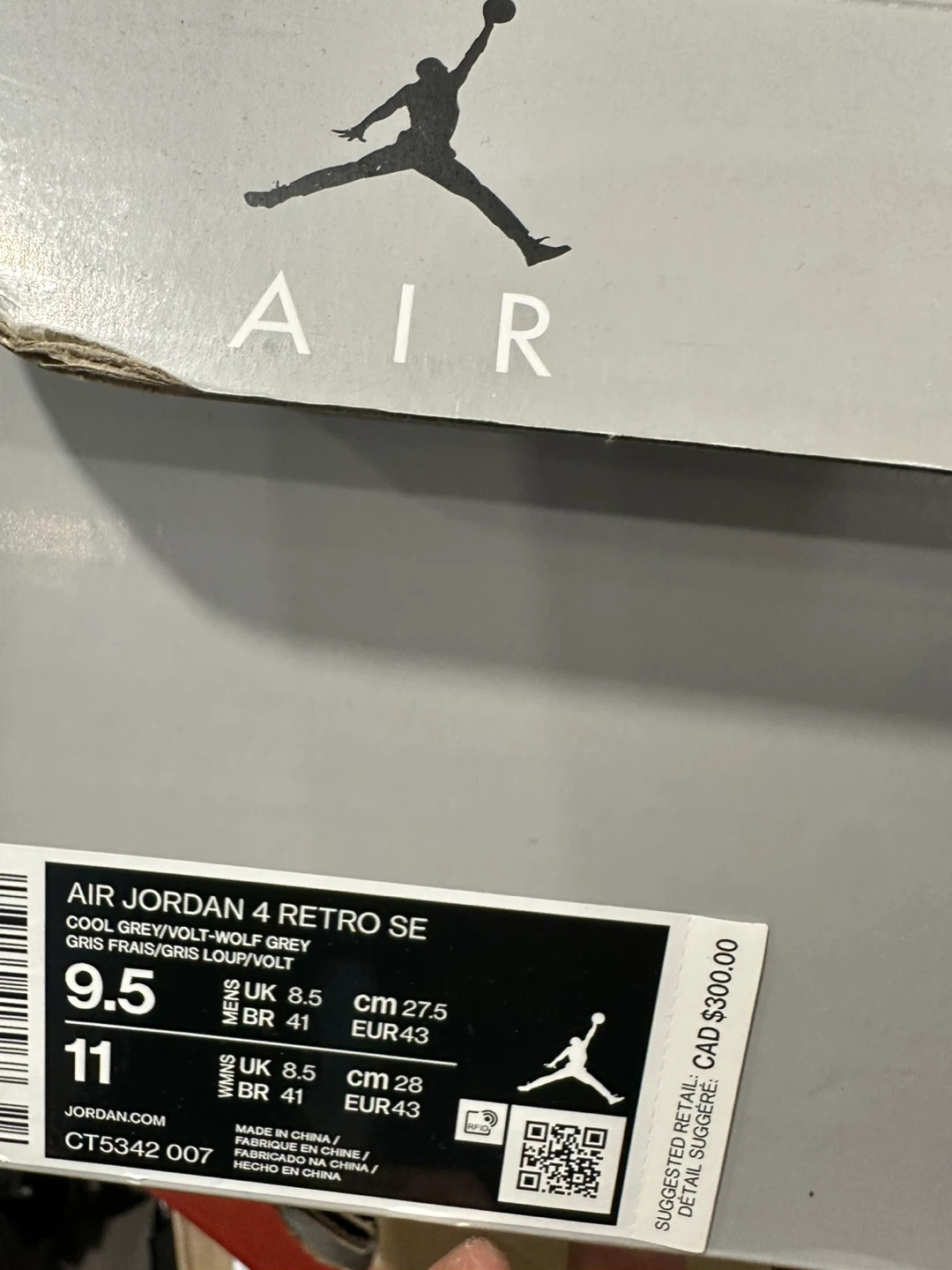 10Selling a pair of Air Jordan 4 Retro SE sneakers. These are a men's size 9.5 (US). They come with the original box. The suggested retail price was CAD $300.00