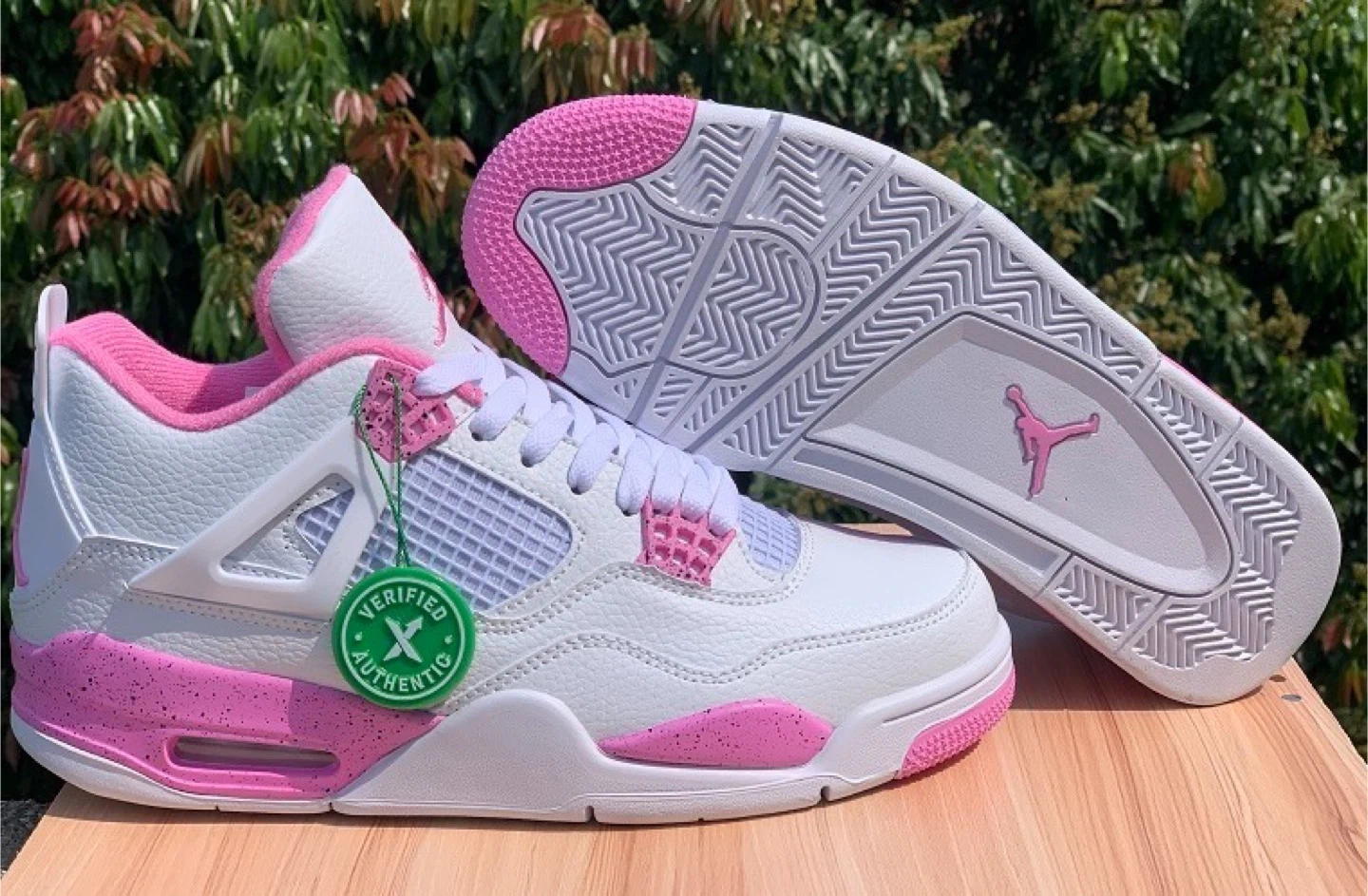 65Selling a pair of Air Jordan 4 Retro sneakers in white and pink. These shoes are in great condition and ready for a new home!